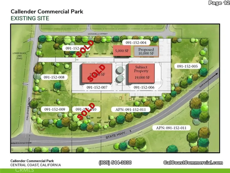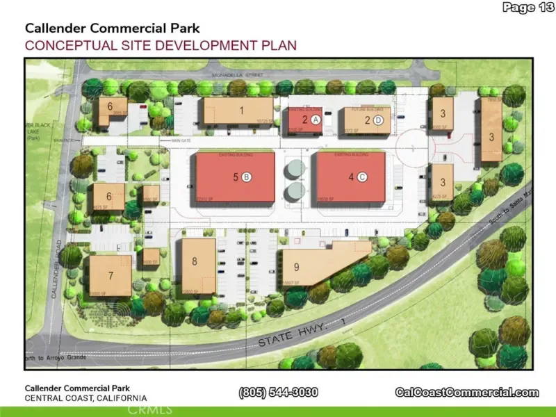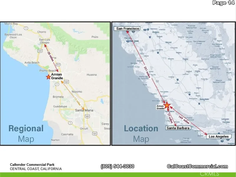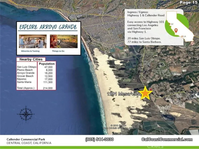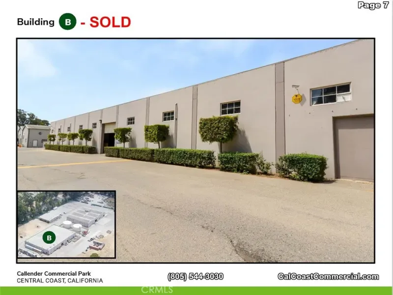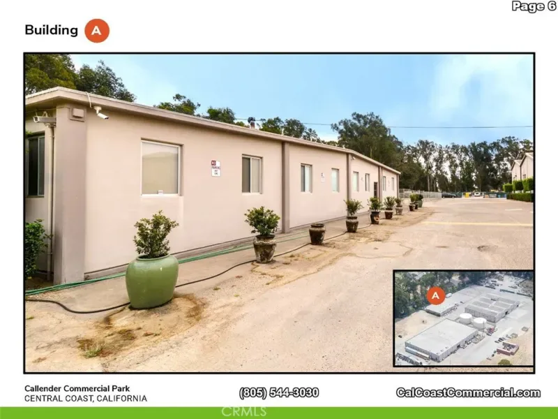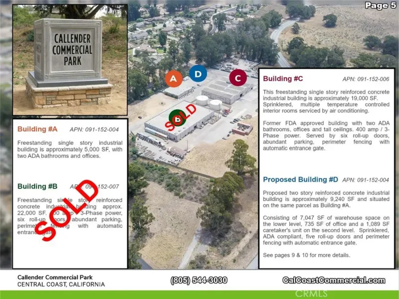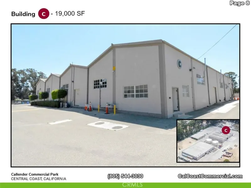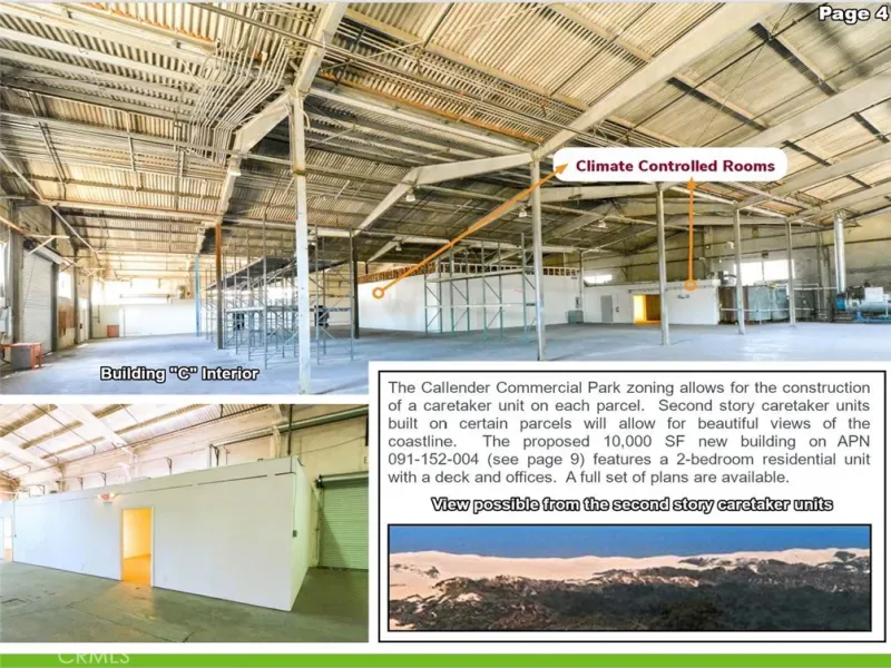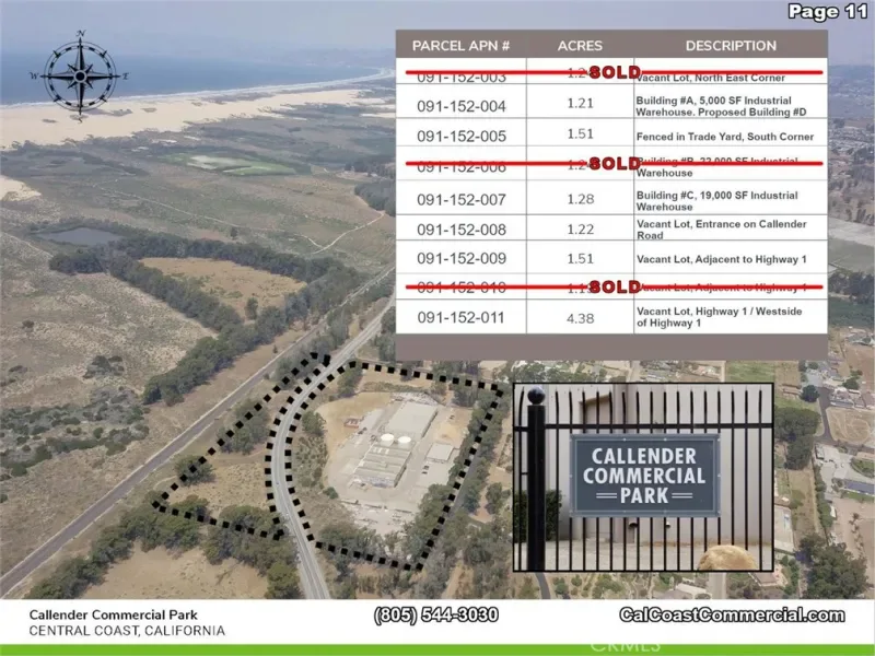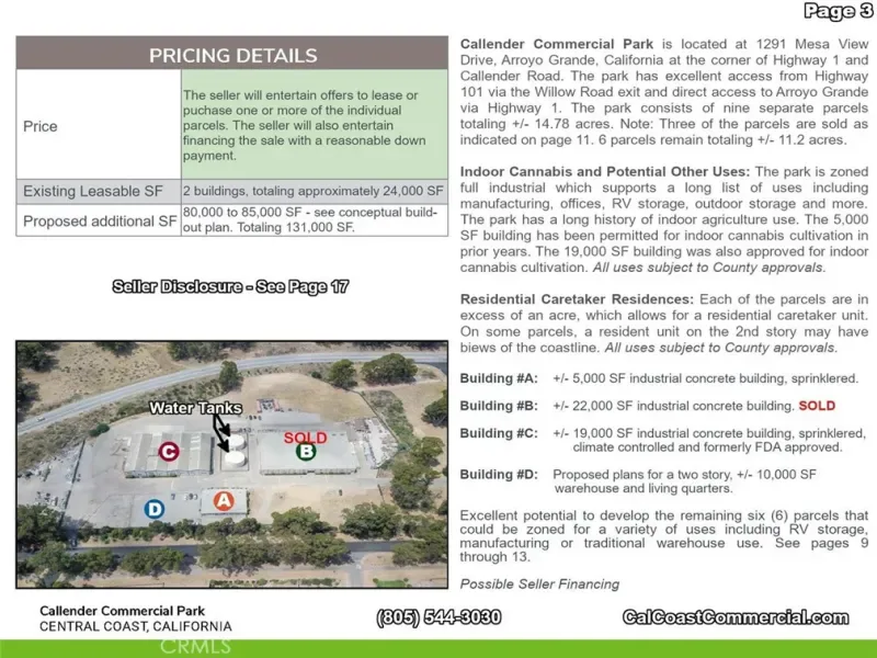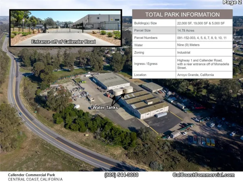 Callendar Commercial Park includes 6 parcels – 2 commercial/ industrial buildings totaling 22,000 sq. feet with commercial/industrial zoning. The 6 parcels together total 11.2 acres. Each of the two buildings are 19,000 and 5,000 square feet, respectively. The property interior has automatic gate and fenced on the Arroyo Grande Mesa directly off Highway 1. The 6 parcels could be zoned for a variety of uses including RV Storage, manufacturing or traditional warehouse use. Most recently the two buildings were used for indoor agricultural growing. The Callendar Commercial Park zoning allows for construction of a caretaker unit on each parcel and could allow for beautiful views of the Pacific Ocean.