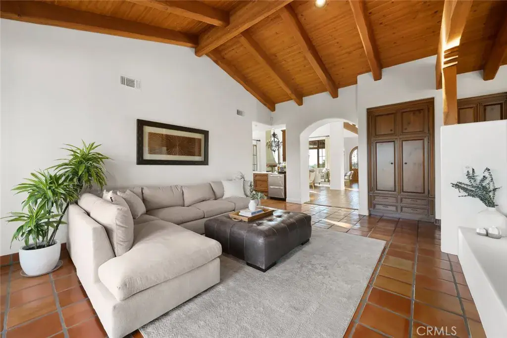 Step through this iconic home to reveal a space defined by a striking fireplace which anchors the interior with charm and draws attention to the custom woodwork and high-beamed ceilings throughout the living area. The main floor is flooded with brightness and the natural warmth of the coastal sunlight that seamlessly flows from the family room, to the wet bar, to a gourmet kitchen complete with a generous center island and breakfast nook.