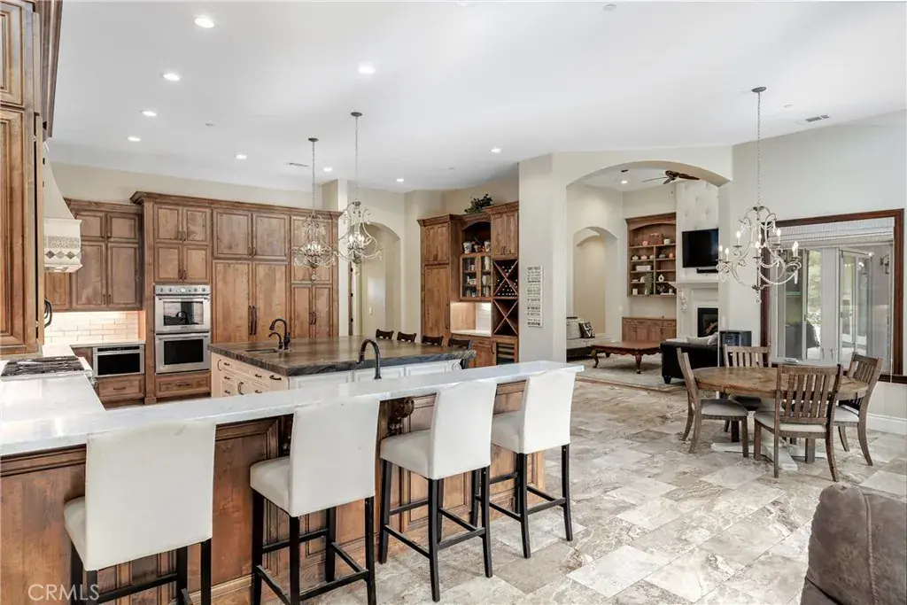 The gourmet kitchen is equipped with high-end Thermador appliances, a wine fridge, warming drawer, and abundant prep space. Custom finishes include Anderson windows, custom blinds, smart home integration, and an 18-ft bi-fold door that creates seamless indoor-outdoor living.