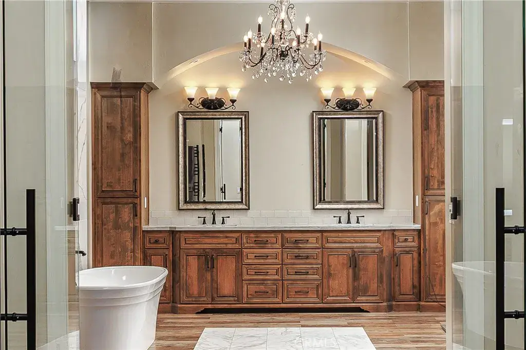 The primary suite is a sanctuary unto itself, featuring a built-in coffee bar, safe, and an extraordinary 500 sq ft master Suite with walk-in closet with remote-lift hanging systems.