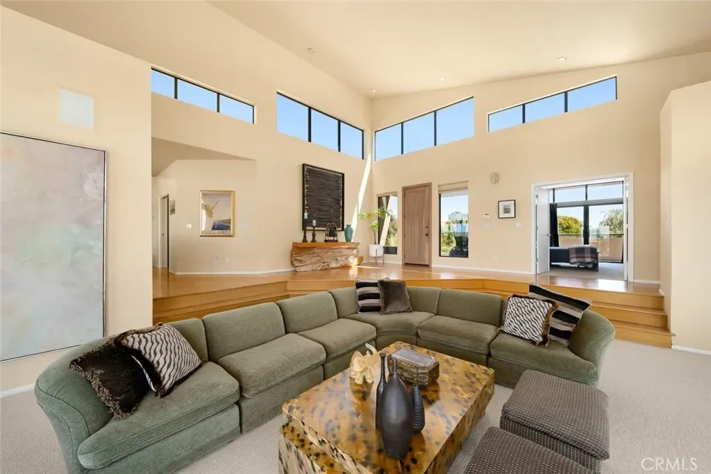 Inside, walls of glass dissolve the boundary between indoors and out, revealing awe-inspiring vistas from nearly every room. The dramatic sunken living room is a showpiece with soaring ceilings, expansive windows, and an abundance of natural light creating a space that is both striking and serene. The adjacent family room offers a more intimate retreat, anchored by a fireplace and opening seamlessly to the expansive decks beyond.