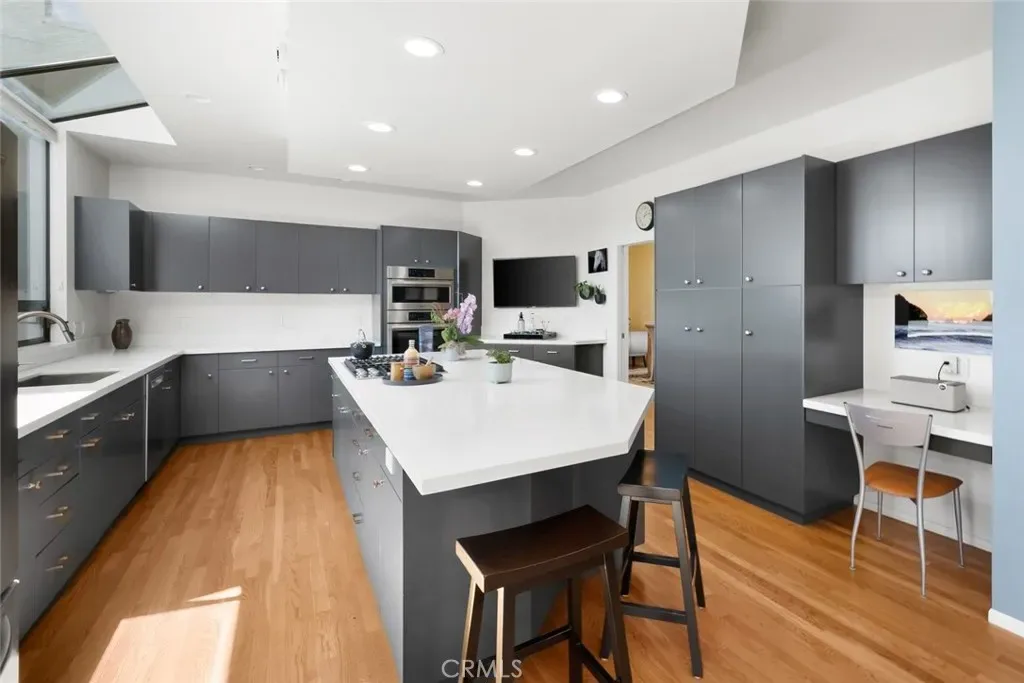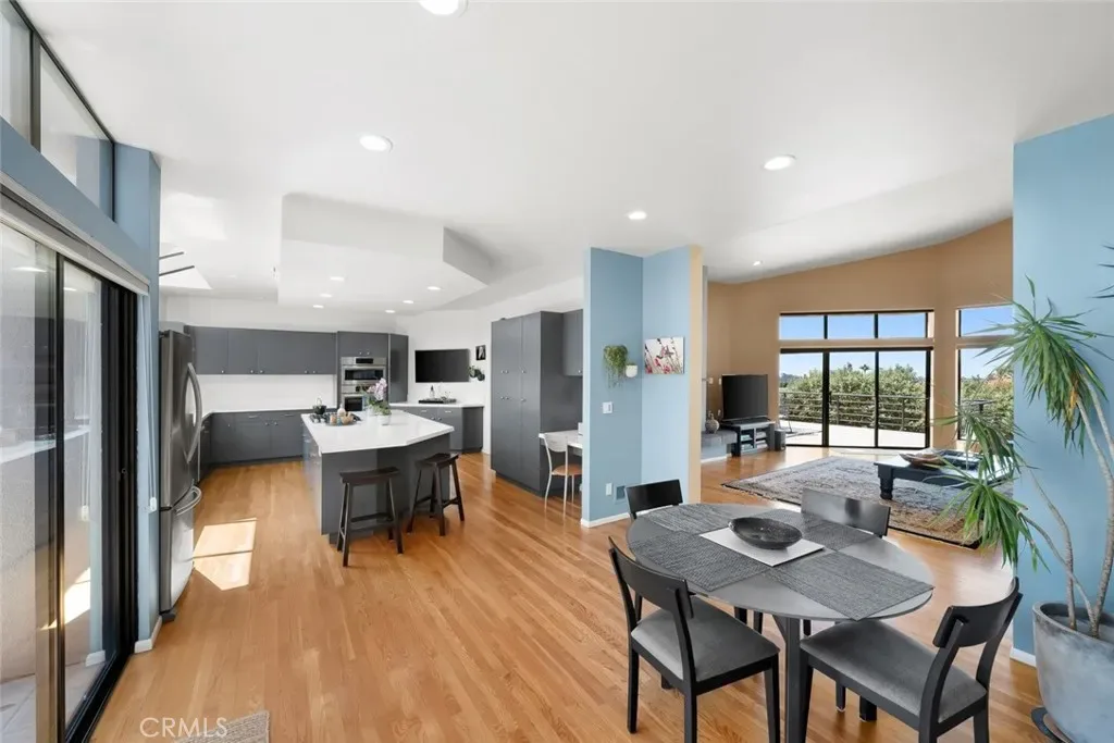 Designed for effortless entertaining and elevated daily living, the home features multiple dining experiences, from a refined formal dining room to a sunlit breakfast nook and unforgettable al fresco settings. The kitchen is sleek and sophisticated, appointed with custom tinted cabinetry, luminous countertops, a generous island with seating, and stainless steel appliances.