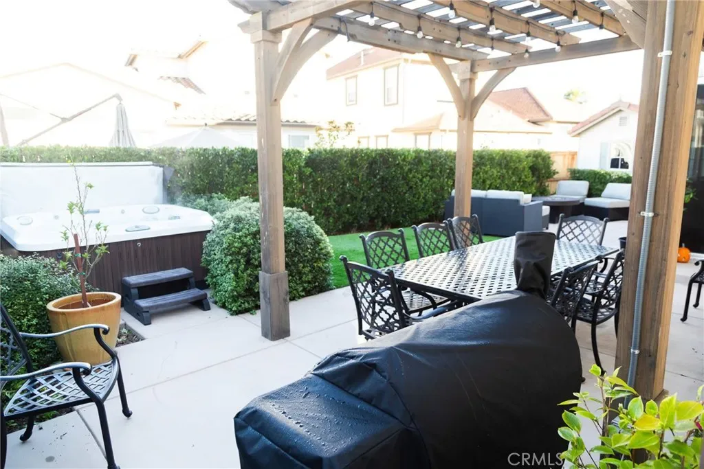 The quaint backyard is a low-maintenance, drought-tolerant oasis featuring realistic synthetic lawn, a beautifully lighted pergola for evening ambiance, and a gorgeous matching custom shed with ample room for storage, tools, or a workshop—lush green appeal year-round with minimal water use.