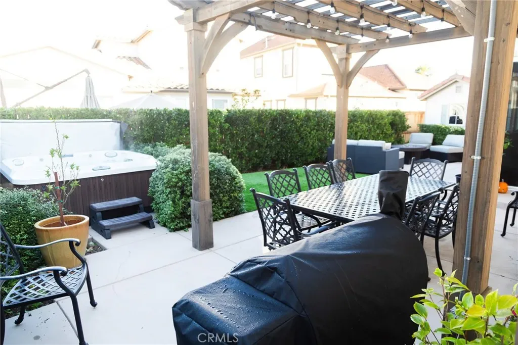 The quaint backyard is a low-maintenance, drought-tolerant oasis featuring realistic synthetic lawn, a beautifully lighted pergola for evening ambiance, and a gorgeous matching custom shed with ample room for storage, tools, or a workshop—lush green appeal year-round with minimal water use.