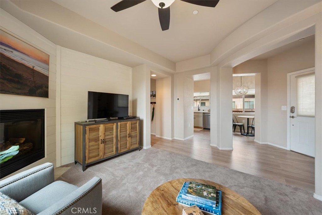 The home also features; Inside laundry with a newer GE Profile combo washer/dryer and custom shelving, custom cordless, light-filtering top-down/bottom-up shades throughout, a beautifully updated fireplace with shiplap accent wall, luxury vinyl plank flooring and plush carpeting. Enjoy seamless indoor-outdoor living with a private patio accessible from both the living room and primary suite, complete with a convenient storage closet.