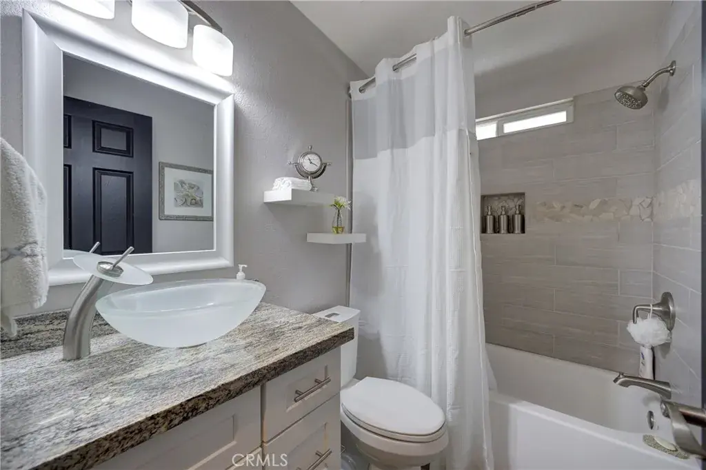 The spacious indoor laundry room offers plenty of extra storage and is conveniently located near the back entrance. The split floor plan features two guest bedrooms and a full bath with an updated vanity and tub/shower combo on one side of the home. On the opposite side, the primary suite offers a walk-in closet and ensuite bathroom with a vessel sink and beautifully tiled walk-in shower.