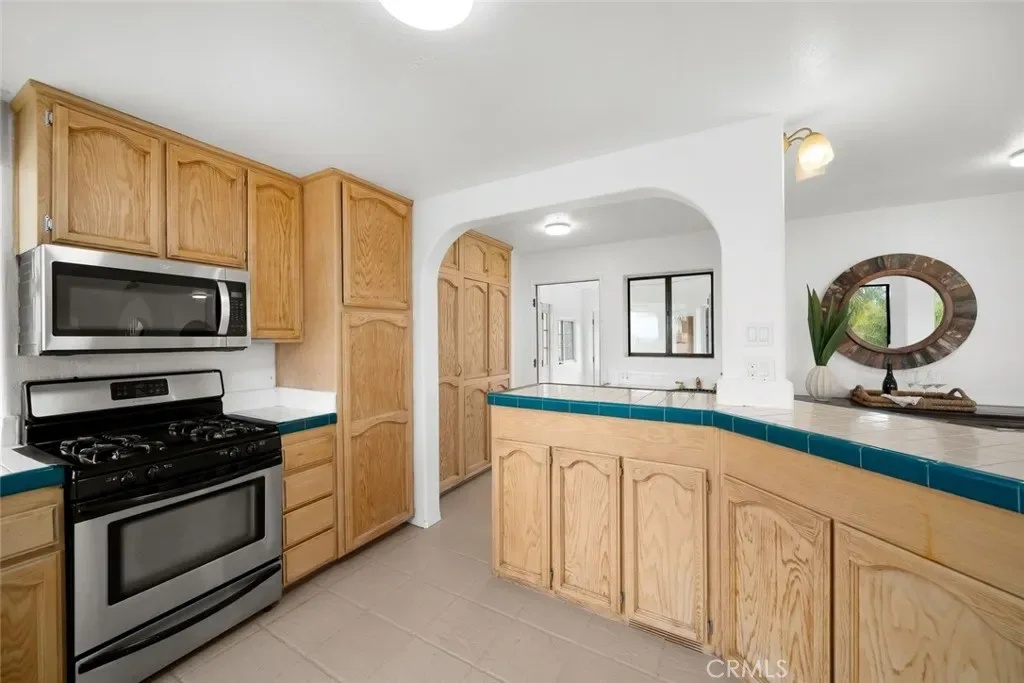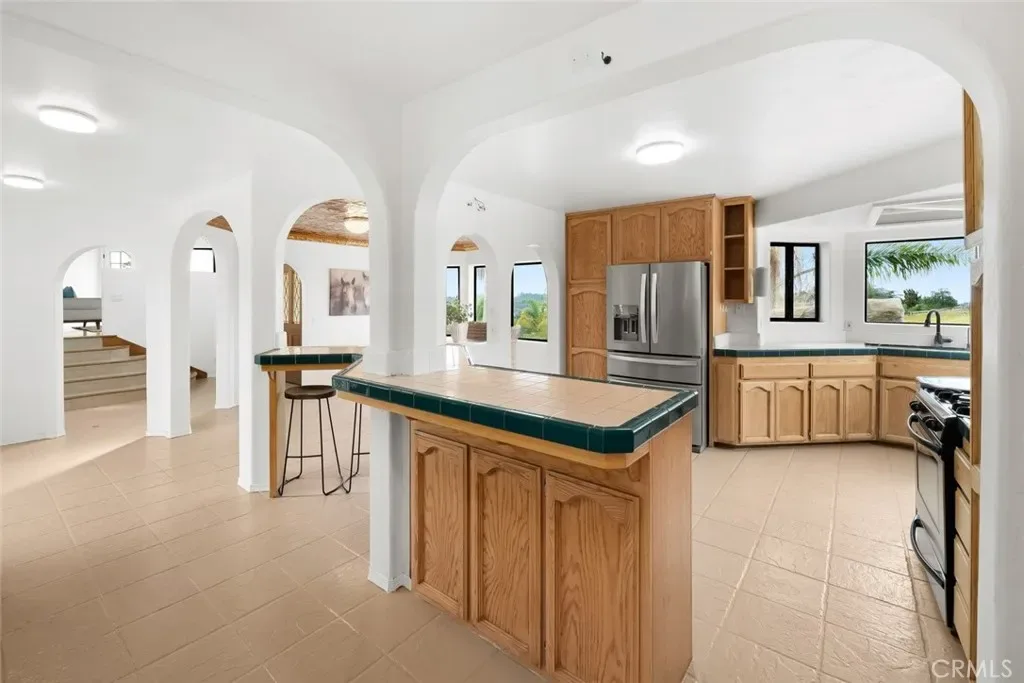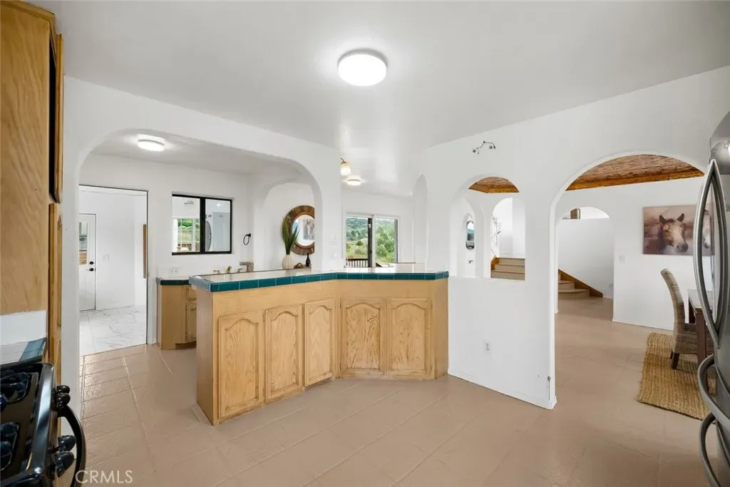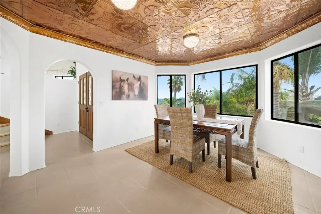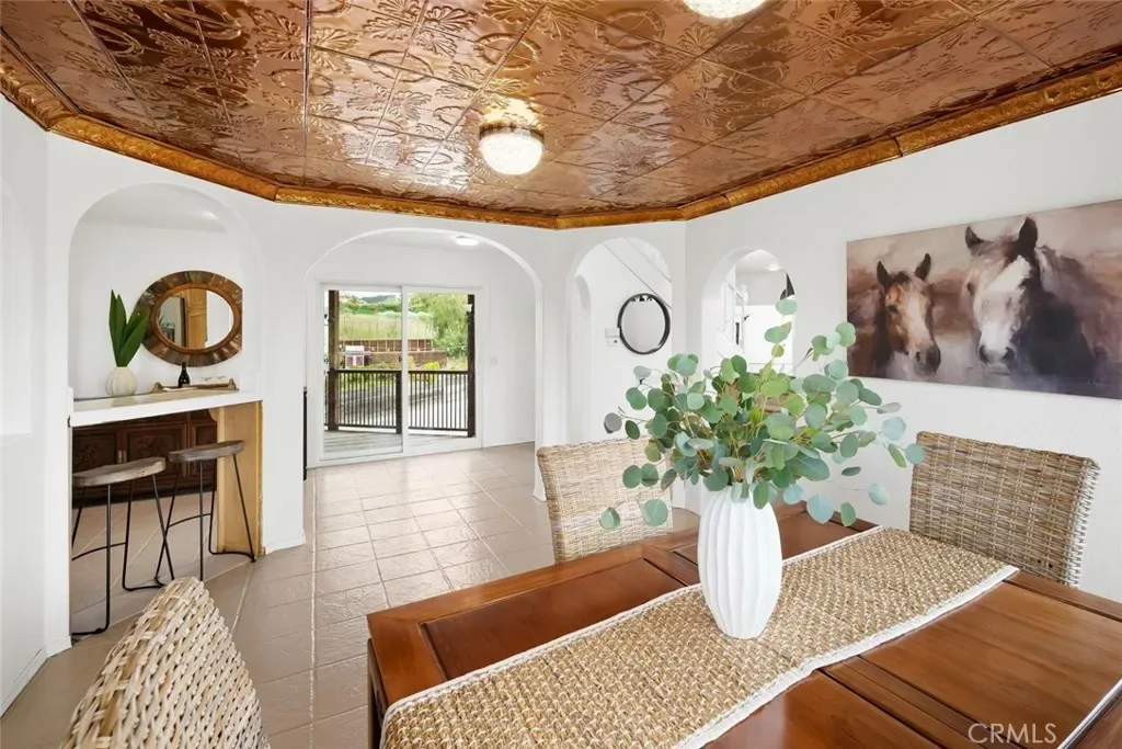 The spacious kitchen features tile countertops, modern appliances, abundant cabinetry, and a wet bar with additional storage. A breakfast bar offers extra seating and workspace. The kitchen opens to a dining area with beautiful property views, copper ceiling tiles, and access to the back porch. A charming under-stair storage nook adds functionality.