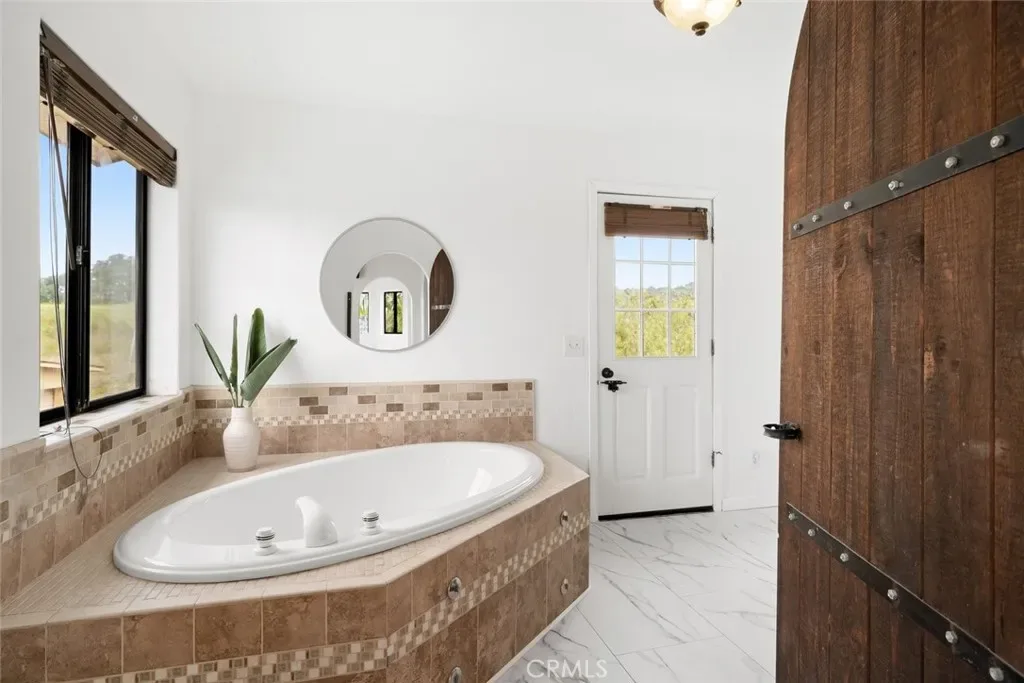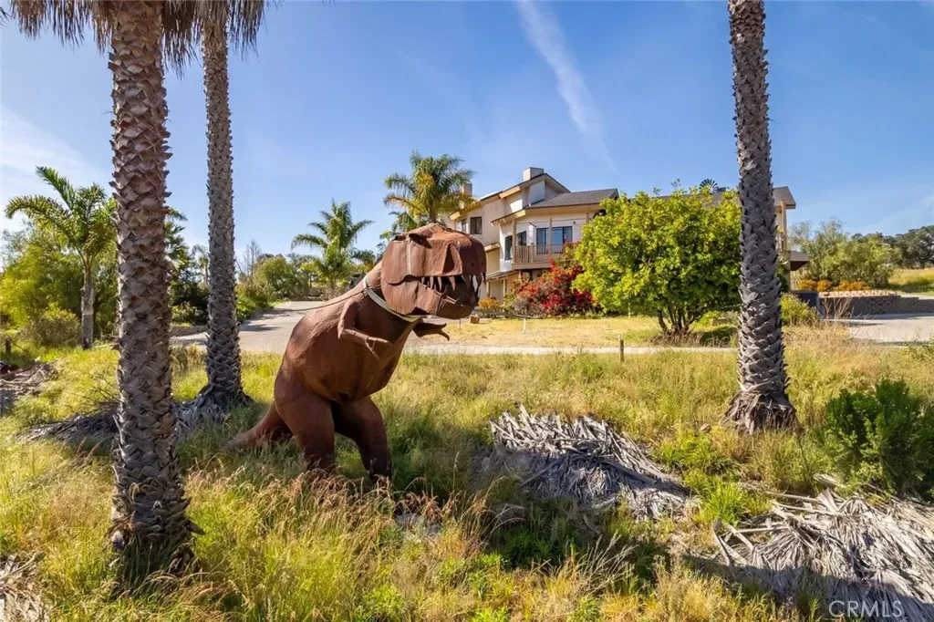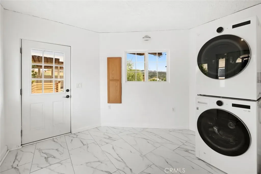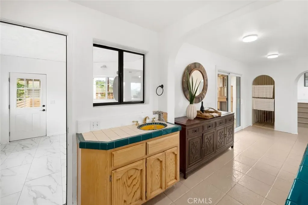 From the gated entrance, fragrant landscaping with succulents, sage, palm trees, and citrus trees creates a warm welcome. Unique hardscape features and a circular driveway center the home within the property, creating a striking arrival. Stained-glass entry doors open to an inviting interior that flows from the dining room to the kitchen and laundry area. The laundry room conveniently connects to both the kitchen and the back porch.