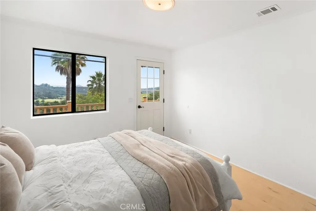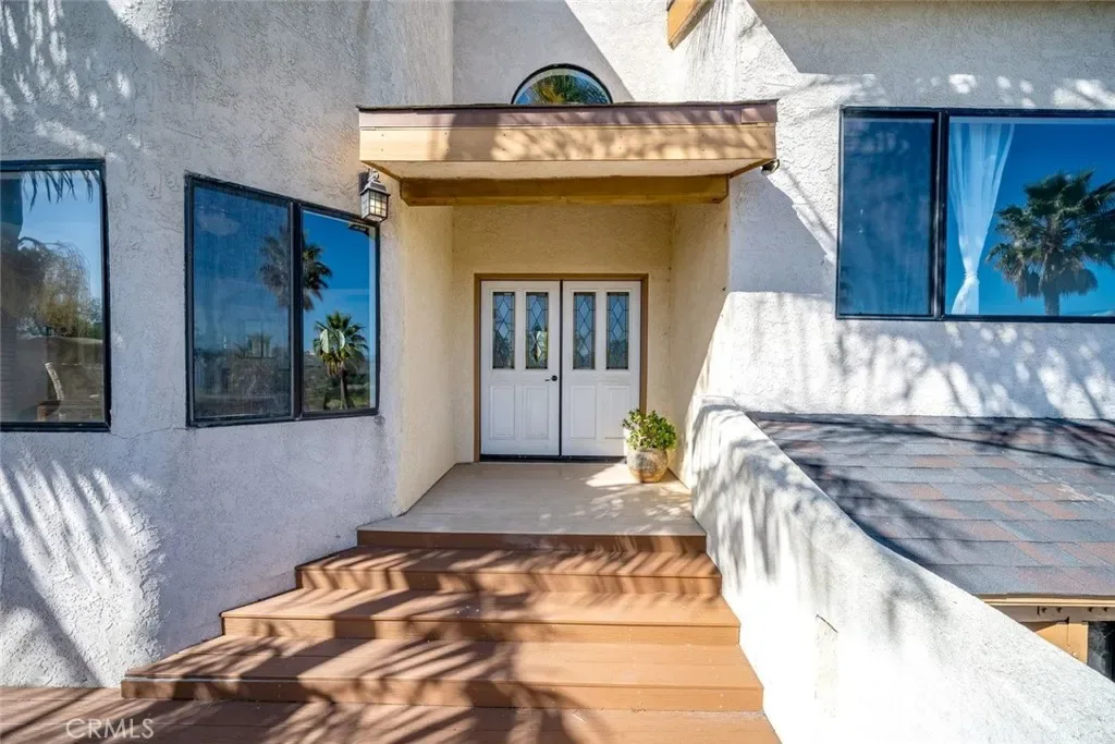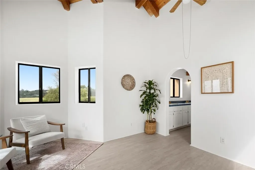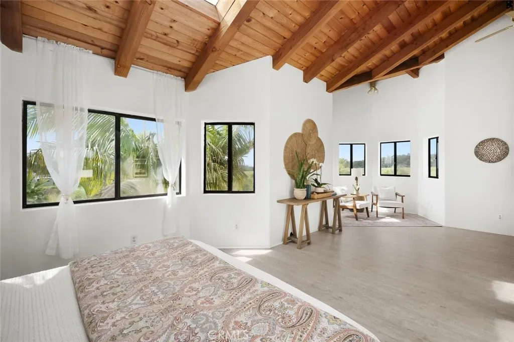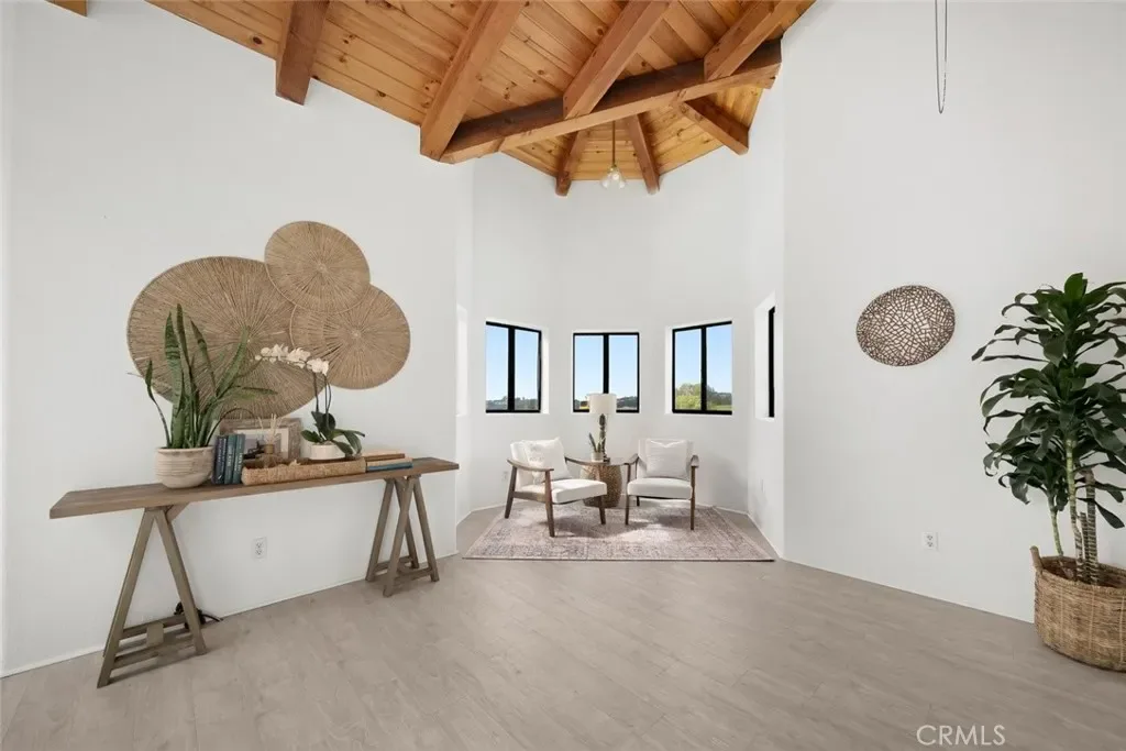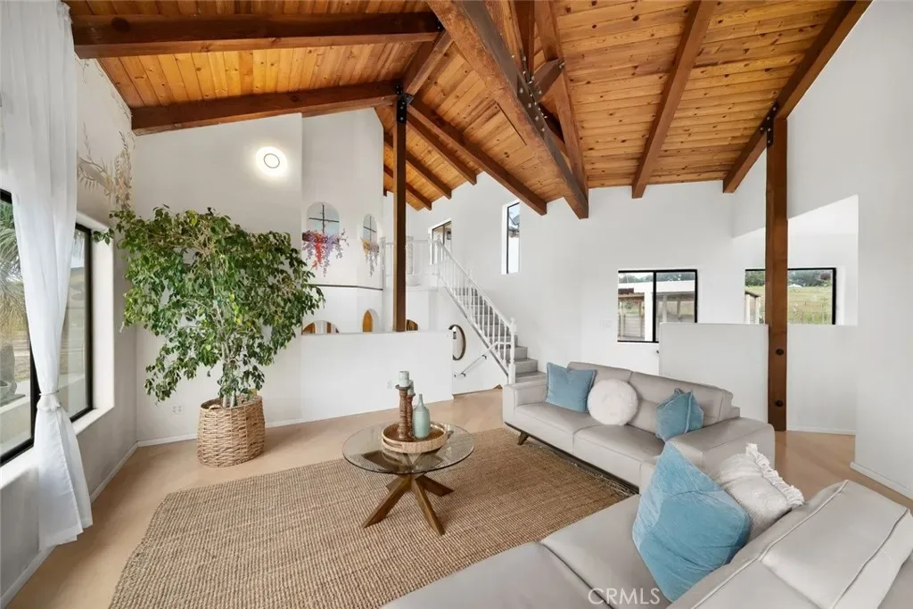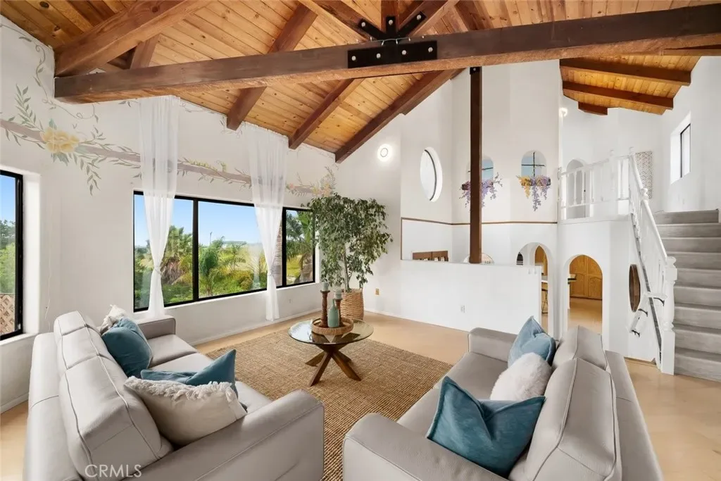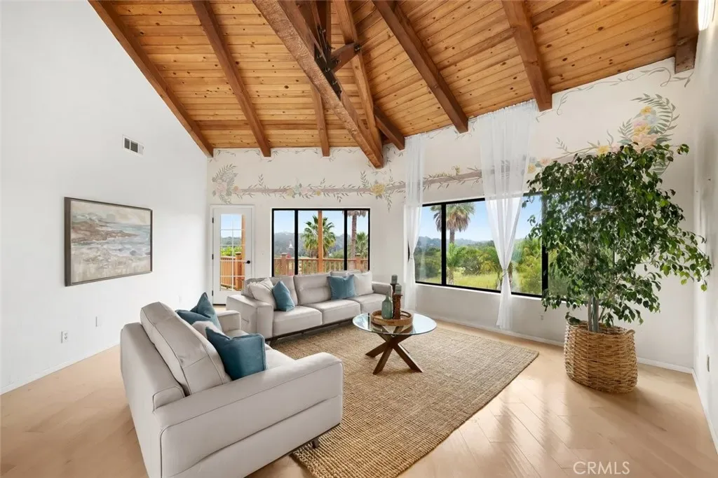 Soaring wood-beamed ceilings bring warmth and natural light throughout the home. A short flight of stairs leads to the primary living room, where expansive windows frame sweeping views of rolling hills and surrounding landscape. Decorative mural artwork adds character, and the room opens to a scenic balcony.