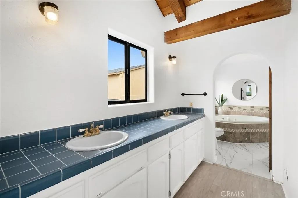 Up another short flight of stairs is the private primary suite featuring skylights, a sitting area, and sweeping views stretching all the way to the ocean. The ensuite bath offers a dual-sink vanity, soaking tub, walk-in tile shower, walk-in closet, and private balcony.