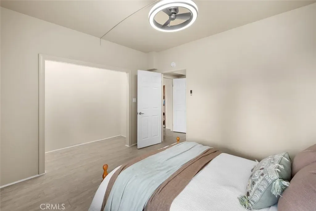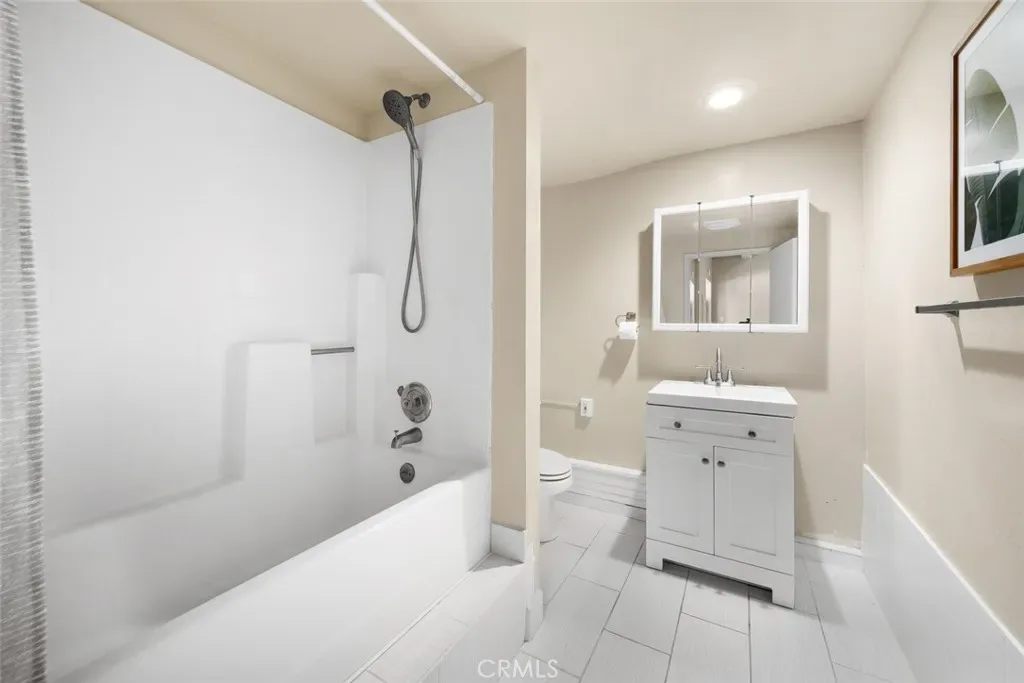 Two bedrooms are located just off the living room, both with balcony access. The nearby bathroom includes a dual-sink vanity and a shower/tub with tile surround.