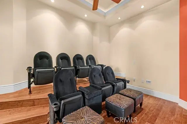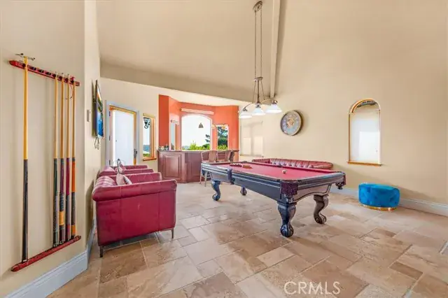 The second floor includes four additional bedrooms, one configured as a guest suite with kitchenette, along with the main kitchen, dining area, and gathering spaces. A spacious balcony and patio showcase partial ocean and mountain views, ideal for outdoor dining and entertaining. This level also features a game room with wet bar and a state-of-the-art movie theater designed for comfortable viewing.