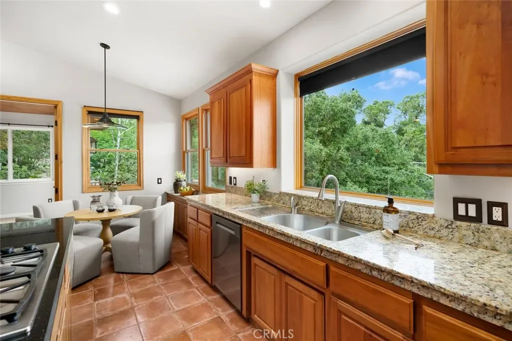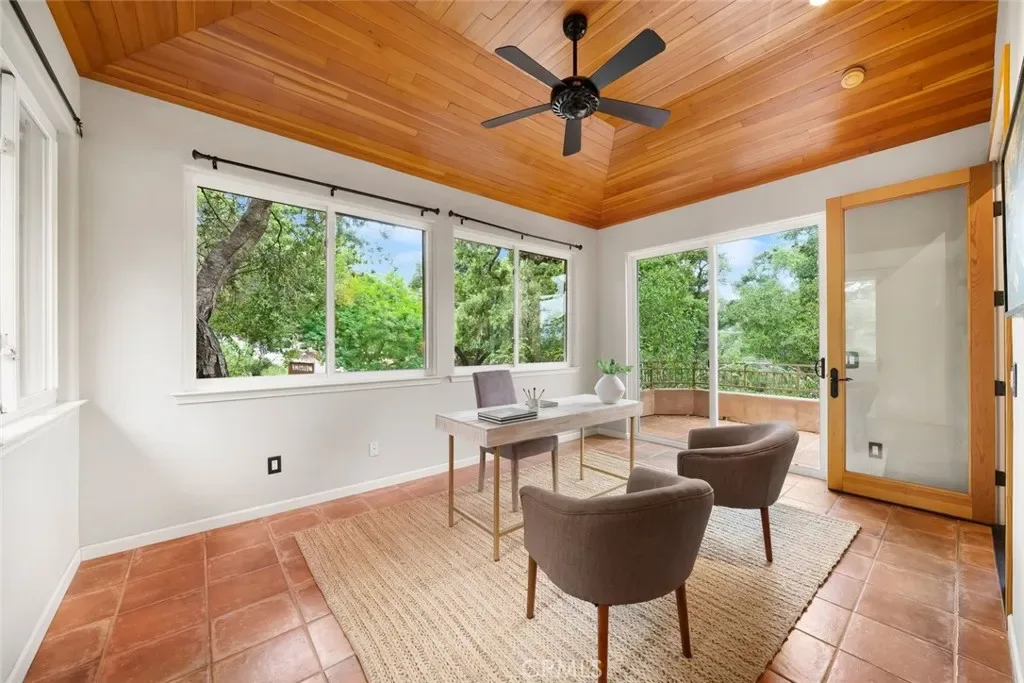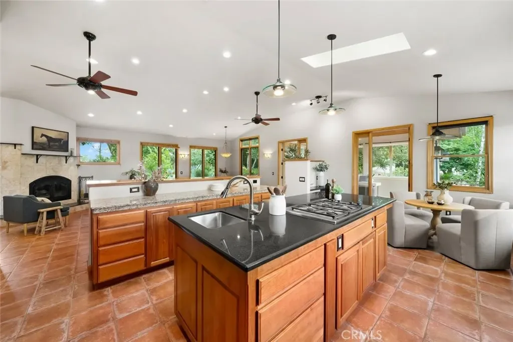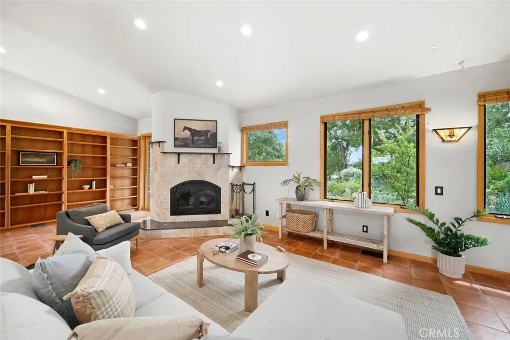 The main living area is thoughtfully arranged on a single level, offering the ease and comfort of single-level living once inside, with the home originally designed to accommodate a future elevator. Vaulted ceilings, Spanish tile flooring, and two fireplaces create a warm yet sophisticated ambiance, while the light-filled open living spaces flow effortlessly into a generously sized kitchen featuring abundant custom cabinetry and storage.