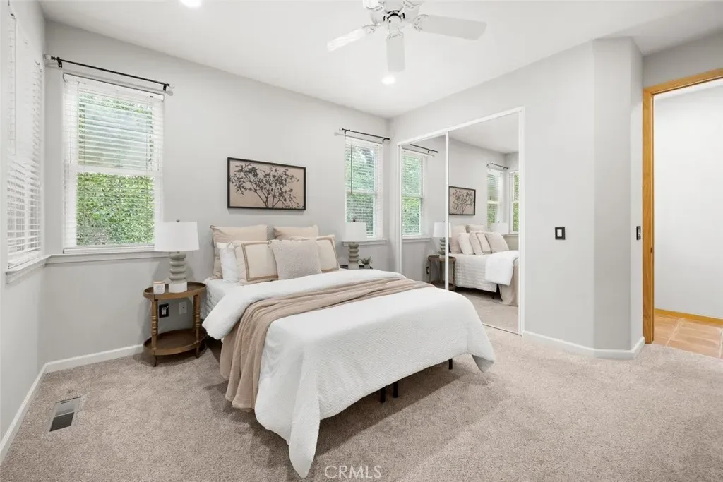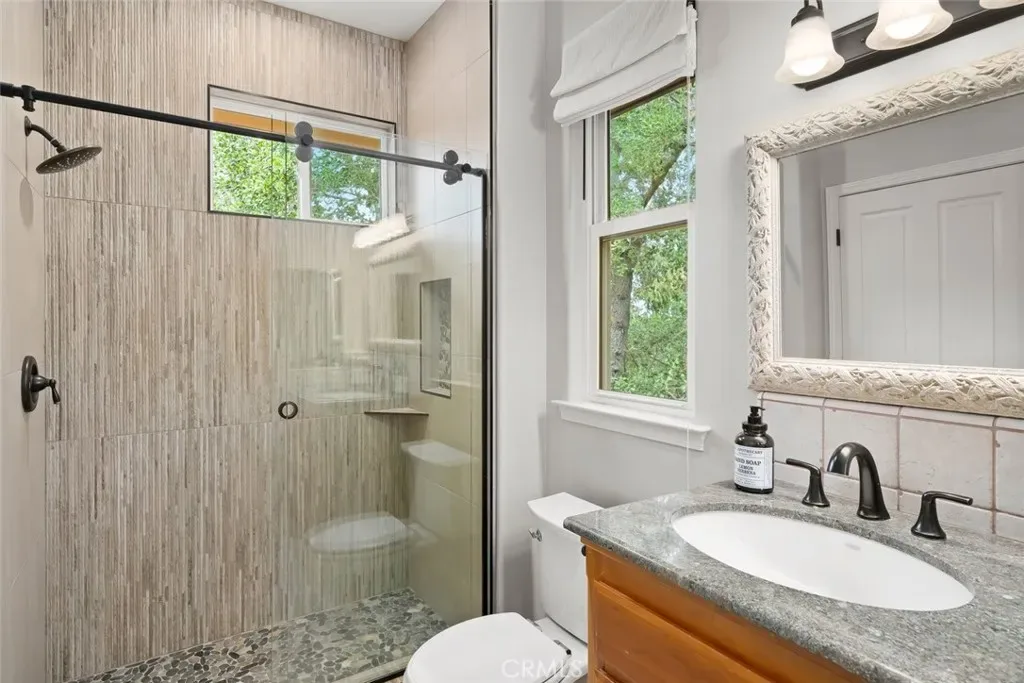 The primary suite serves as a private retreat, complete with its own fireplace, dual walk-in closets, and a secluded deck overlooking the serene backyard setting. Two additional bedrooms and bathrooms provide comfortable accommodations for family or guests.
