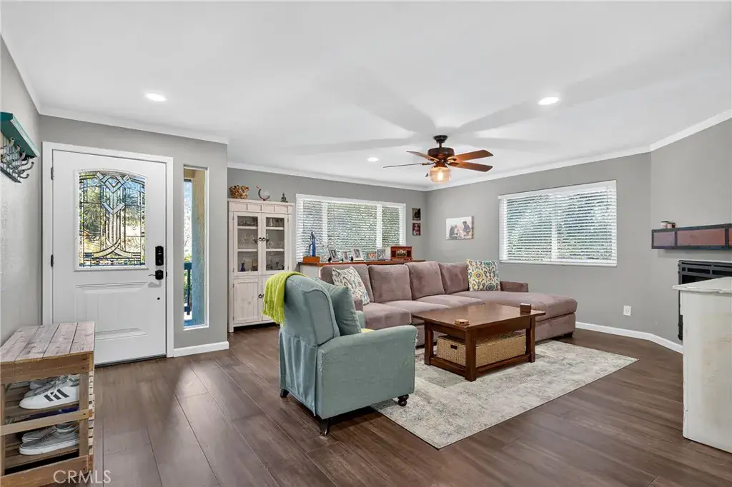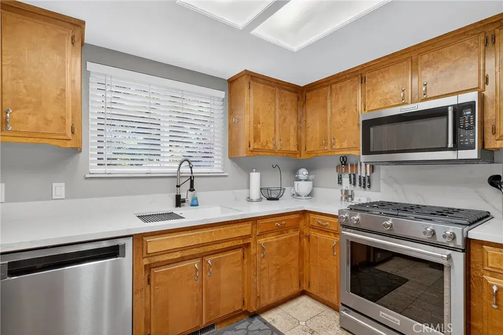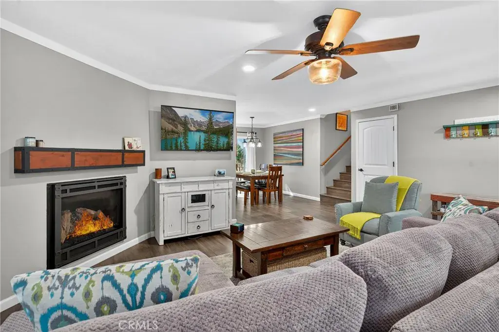 Inside, the home invites you with espresso-stained bamboo flooring and an airy living room centered around a cozy gas fireplace. The kitchen showcases quartz countertops, travertine tile floors, stainless steel appliances, and a stylish sink and faucet—creating an elegant space for cooking and gathering. The split-level floor plan places the main living areas on the entry level, with just seven steps leading to the upper level where 3 bedrooms and 2 beautifully remodeled bathrooms await. The centrally located laundry area adds everyday convenience, while updated lighting, ceiling fans, and dual-pane windows bring comfort throughout. Energy-efficient power purchase agreement solar further enhances everyday living while helping to reduce utility costs.