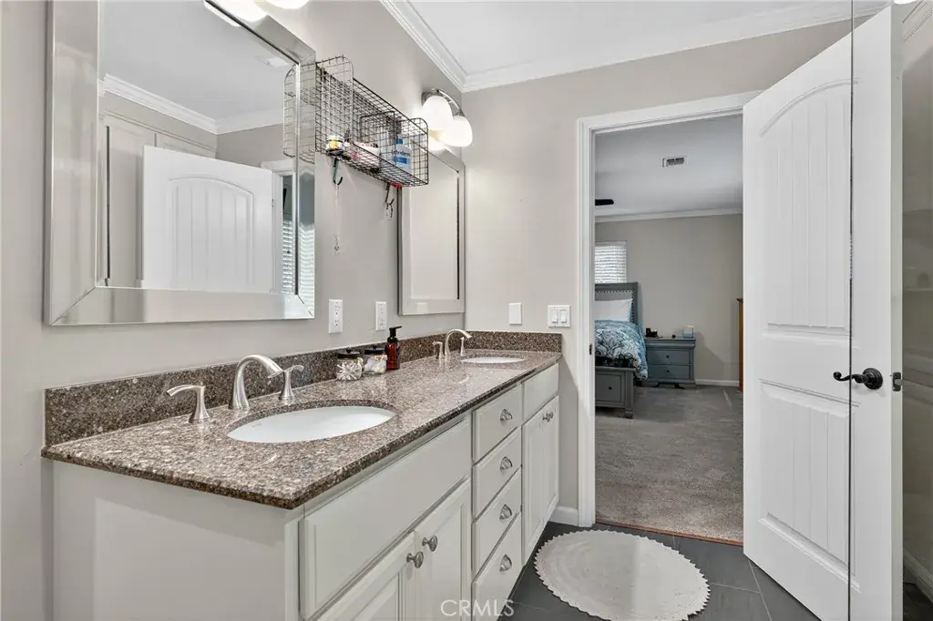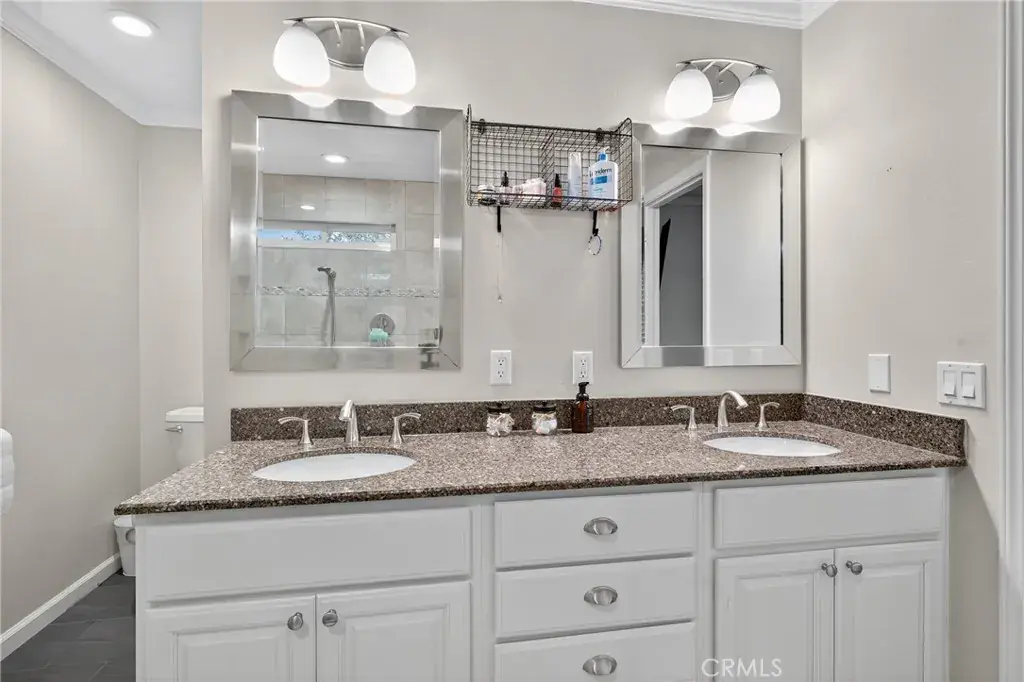 The primary suite features a walk-in closet and a remodeled en suite bath with quartz counters, dual sinks, and a custom tile shower with glass surround. The hall bath is equally refined with quartz countertops and an updated tile surround over the tub.