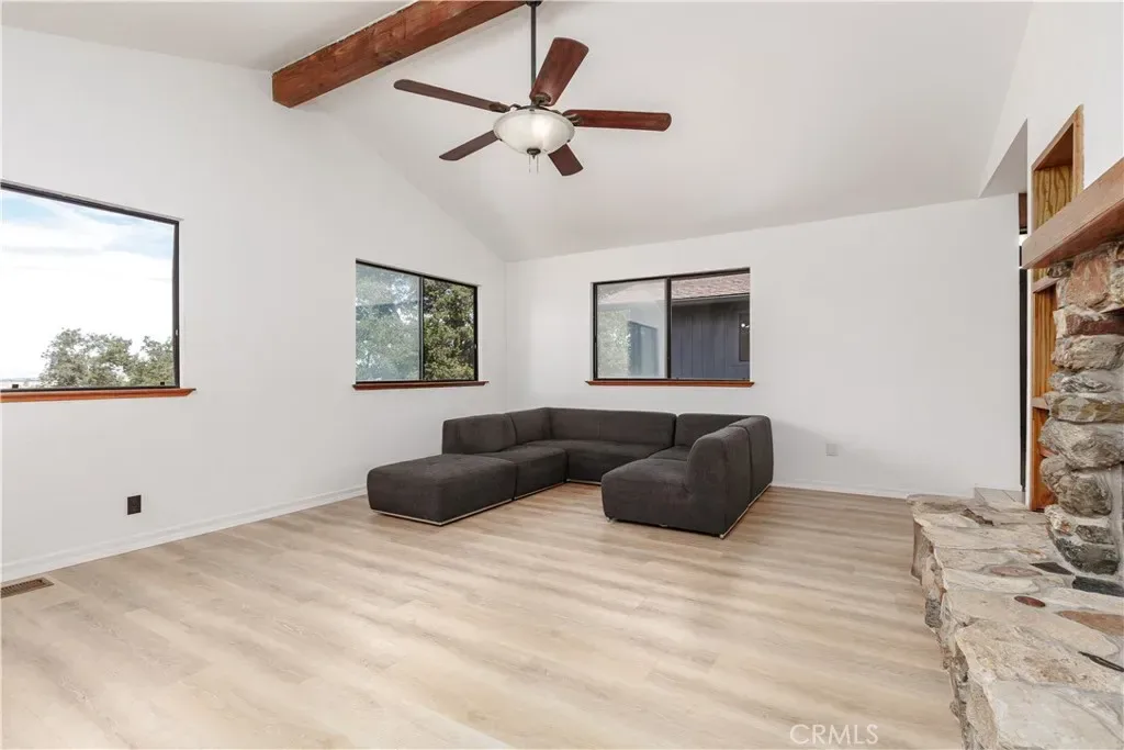Inside the main home, the living room features cathedral ceilings, a stone-surround fireplace, expansive windows, and new flooring. The remodeled kitchen includes quartz countertops, stainless steel appliances, ample bar seating, and an adjacent dining area. The primary suite opens to a private balcony and includes a remodeled bathroom with dual sinks, a walk-in glass shower, and a freestanding soaking tub.