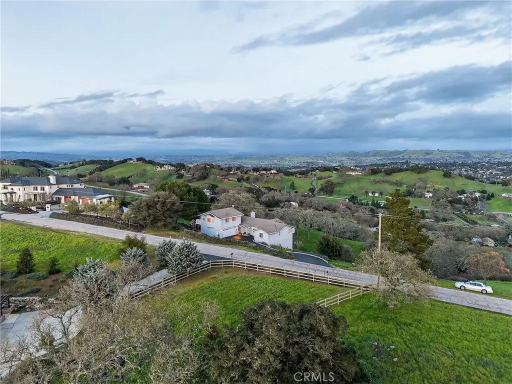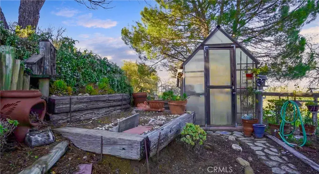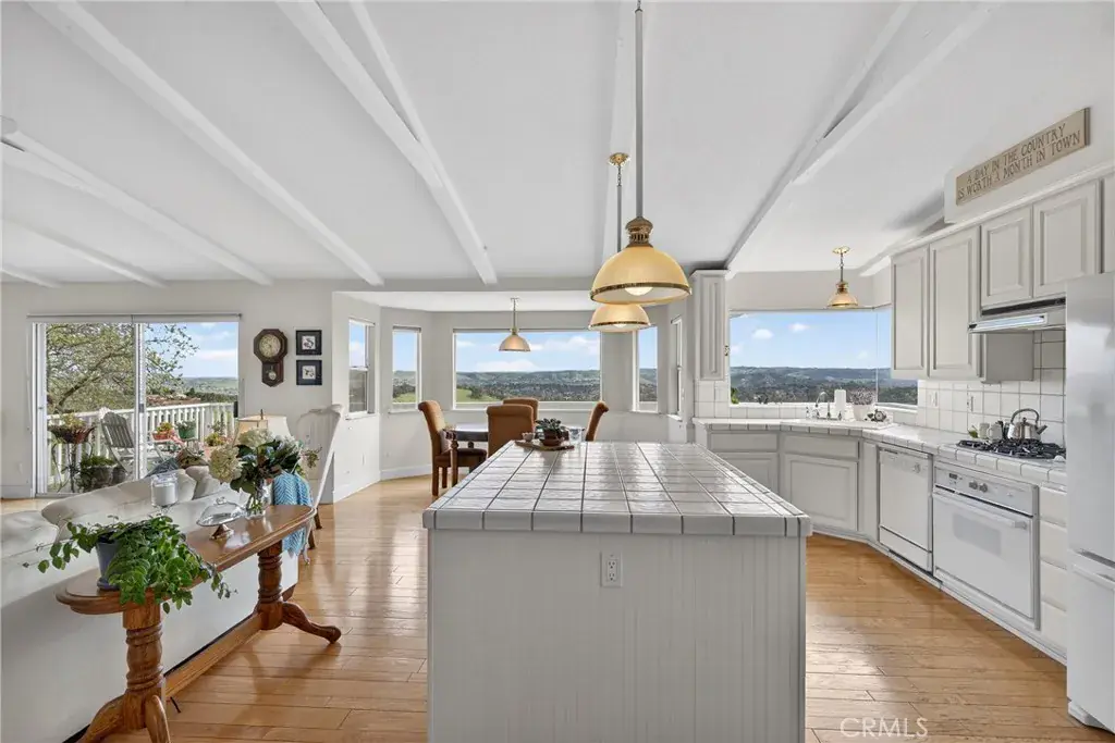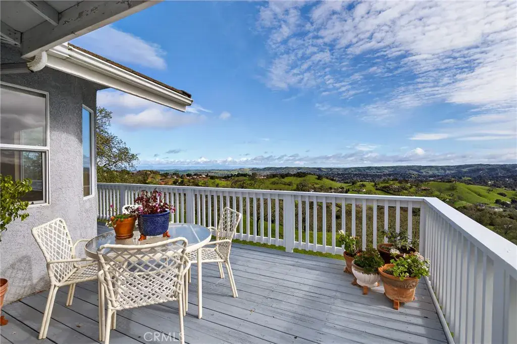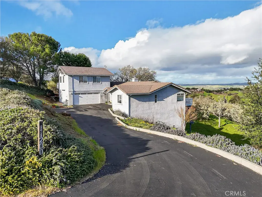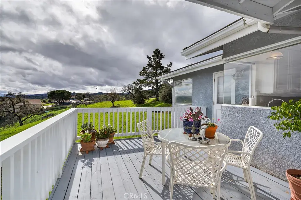 Sweeping panoramic hill and valley views define 11200 Santa Ana Road, a one-owner property positioned to capture the scenery from nearly every angle. Located in the desirable Long Valley Ranches neighborhood, this Central Coast home offers a rare blend of privacy, views, and flexible living spaces in a peaceful hillside setting. The main residence features an open-concept layout with vaulted ceilings and exposed beams, creating a light and airy feel throughout the living and dining areas. Sliding glass doors from both the living room and the primary suite open to upper-level decks, seamlessly blending indoor and outdoor living.The primary suite is privately separated from the additional bedrooms, offering a true retreat. Two secondary bedrooms are located in the opposite wing, one currently used as an office and featuring a glass door that opens directly to the back deck. The kitchen is positioned to enjoy the scenery and includes tile countertops, abundant cabinetry, a center island, and hill views from the kitchen window. The dining area is surrounded by windows, allowing natural light and rolling hills to frame everyday living. A cozy fireplace anchors the main living space, while the primary suite offers its own fireplace and deck access with tranquil views. The primary bathroom includes dual sinks, tile countertops and flooring, a soaking tub beneath tall windows, a walk-in shower with frosted glass enclosure, and built-in storage. A hall bathroom with high ceilings, tile finishes, and natural light connects to the second bedroom. A spacious laundry room offers extensive cabinetry and a generous folding counter. Recent upgrades include the air conditioning system and decking. Adding exceptional flexibility is the fully permitted guest house located above the garage, built in 1995. This private space features an open kitchen flowing into the living area, a center island, hill views from the kitchen window, a spacious bedroom with scenic views, a bathroom with tile flooring and a walk-in shower, new carpet throughout, and its own private deck. The stairway is pre-wired for a chair lift, offering future accessibility. Outdoor living is a highlight, with multiple upper-level view decks, peaceful walking paths, and a charming garden area complete with a greenhouse. With its elevated setting, captivating views, and thoughtfully designed living spaces, 11200 Santa Ana Road offers a peaceful Central Coast lifestyle that feels both private and connected.