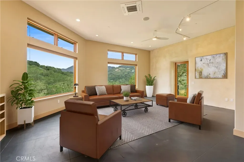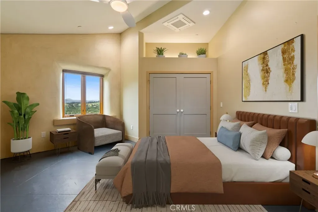 Discover the unique charm of 8140 Castenada Lane, a newly built, single-level home in Atascadero with straw-built walls on 2 sides for energy efficiency and design. This 1977 sf, 2-bedroom, 1.5-bathroom residence was thoughtfully designed to blend seamlessly with the picturesque ~4.19 acre landscape that surrounds it. Style greets you from every approach—whether you ascend the front steps or drive up to the back door. Completed in 2022, the home is equipped with a modern heat pump/split system and fire sprinklers, ensuring comfort and safety. Parking is available in the generous 1-car garage located beneath the main living area with additional parking available on the spacious grounds. Inside, the home boasts high ceilings and concrete floors throughout reinforcing its one-of-a-kind status. Enter through the double glass doors into a large living room anchored by a Venetian plastered wall and illuminated by large windows with transoms. A unique feature is the cleverly hidden bookshelf that opens with a gentle push to reveal extra storage plus a built-in entertainment console. The modern kitchen features all-electric appliances, lovely wooden cabinetry with custom pull out shelves, and paper stone countertops complemented by a butcher block breakfast bar. The sleeping quarters include a large primary bedroom with sweeping window views and a private half bath. The second bedroom offers a clever peek-a-boo insert showcasing the home’s partial straw-built construction. Separating the bedrooms is a roomy main bathroom with a double sink matching the kitchen’s elevated paper stone counters and wood cabinetry. Outdoors, the property offers significant potential with two separate barns. The larger barn is ~674 SF, and the second is ~480 SF. These structures are yearning to be finished into additional living space easily satisfying a desire for generational living or potential income generation (contact the City of Atascadero for full permitting details). With the placement away from the main home, it ensures everyone enjoys needed privacy. This unique property offers a secluded retreat, sweeping views, yet it is only minutes away from the shopping, dining and entertainment you desire. Call today to schedule a viewing. Please view the Virtual Tour for additional information.