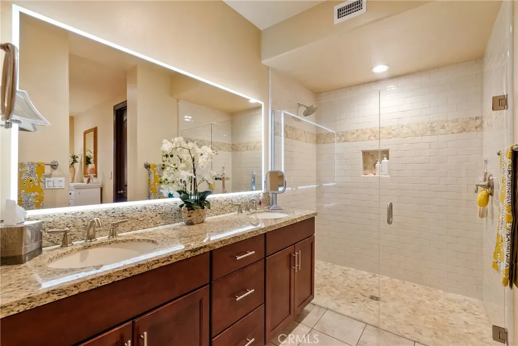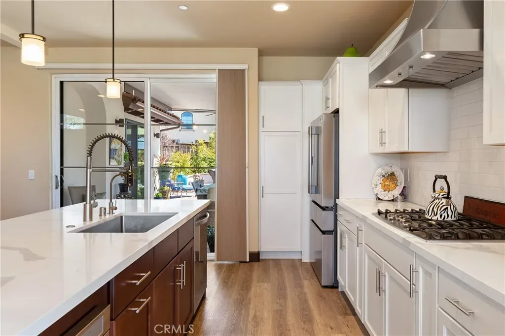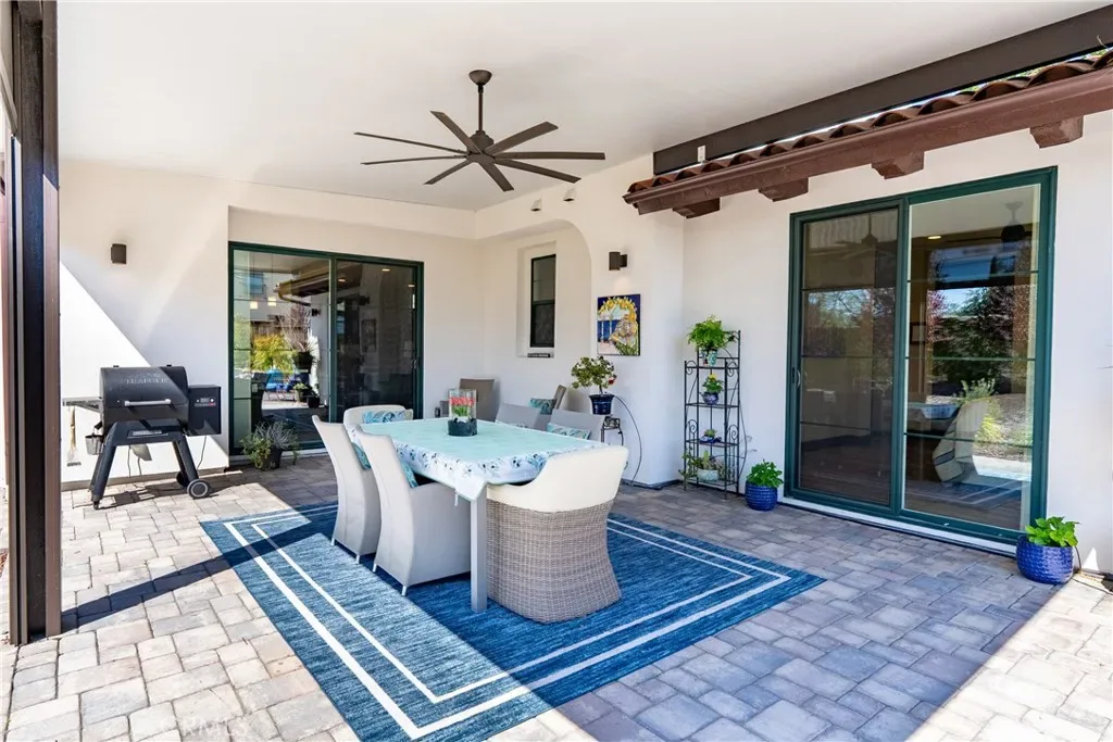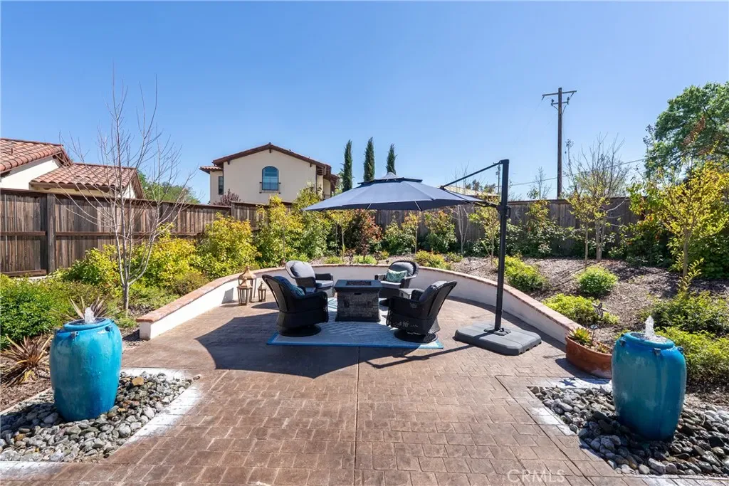 Welcome to 9300 Via Castillo in the Atascadero neighborhood of Cerro Roble! Built in 2021, this Santa Barbara Spanish-style home is a beautifully designed 4-bedroom, 2.5-bath residence offering approximately 2,546± sq ft showcasing modern elegance, thoughtful architecture, and comfortable living on an 11,579± sq ft lot. A brick-paved driveway and walkway lead to the home’s inviting entry, complemented by a landscaped front yard that enhances the property’s refined curb appeal. Inside, the open-concept main level is designed for both everyday living and entertaining. The spacious living room is highlighted by a cathedral ceiling open to the second story, allowing natural light to pour into the space while creating a sense of volume and sophistication. A gas fireplace and striking metal chandelier provide an elegant warm focal point. The kitchen blends style and function with a large center island, quartz countertops, stainless steel appliance package, and double oven, while sliding glass doors from both the kitchen and dining area create a seamless connection to the backyard. The primary suite on the main level offers flexibility and comfort, featuring a walk-in closet, sliding glass door access to the backyard, and a well-appointed bathroom with dual sinks, step-in shower, and a separate toilet room. The first floor also includes a laundry room with upper and lower cabinetry and a convenient half bath. Upstairs, three additional bedrooms provide comfortable accommodations, including one generously sized bedroom offering versatile use as a secondary living space, office, or guest retreat. The upstairs hall bathroom includes dual sinks and a separate shower and toilet room. The backyard is designed to enhance outdoor living with two distinct patio areas finished with stone pavers. The covered patio features electric shades and a ceiling fan, creating a comfortable setting for gatherings or quiet evenings outdoors. A second patio area is enhanced by two decorative blue fountains, adding character and ambiance. The side yard offers a versatile flex area that may be suitable for storage, workspace, or gardening. Additional features include a 2-car garage and a well-planned layout that balances modern style with everyday comfort.