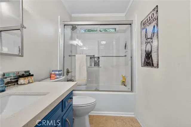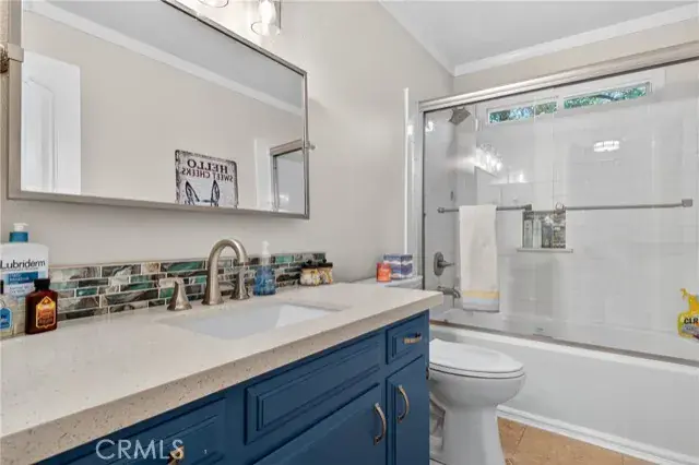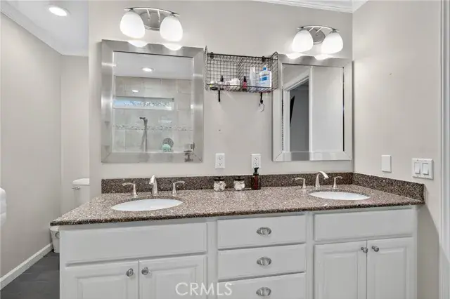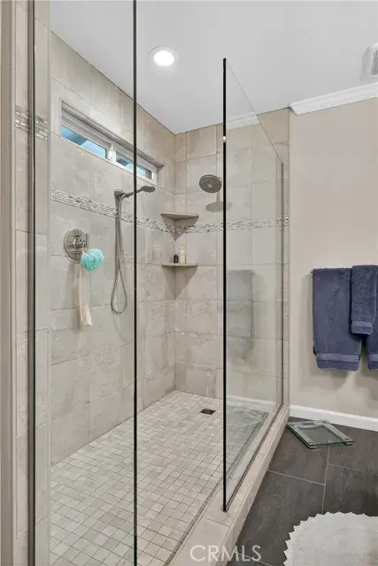 The primary suite features a walk-in closet and a remodeled en suite bath with quartz counters, dual sinks, and a custom tile shower with glass surround. The hall bath is equally refined with quartz countertops and an updated tile surround over the tub.