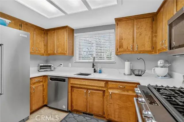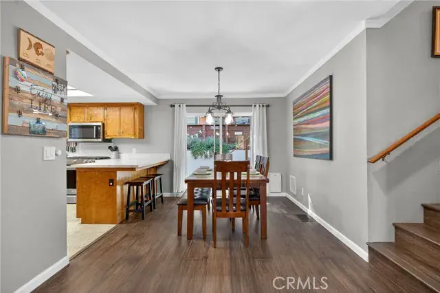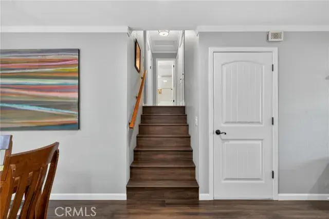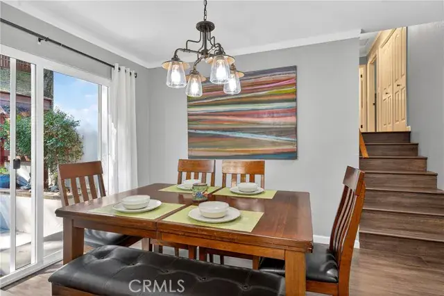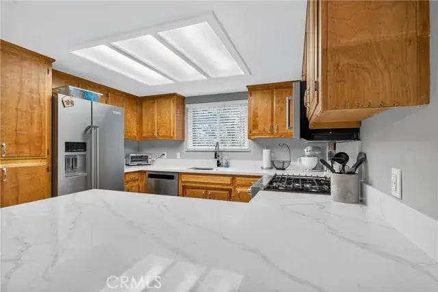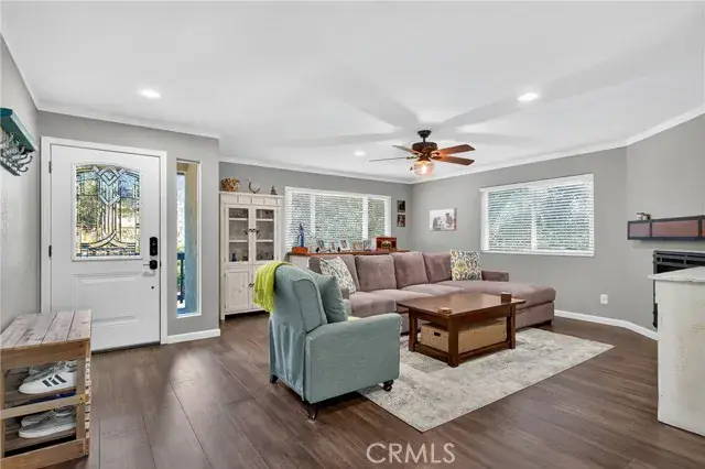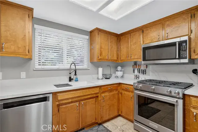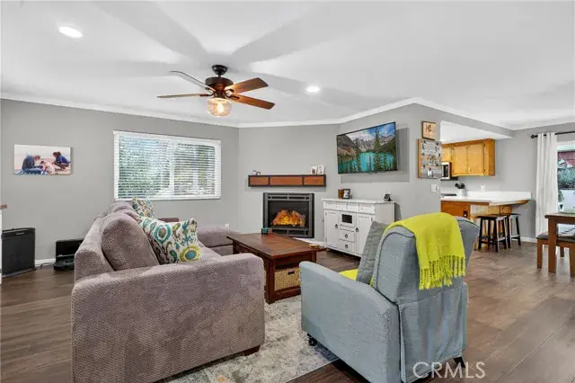 Inside, the home invites you with espresso-stained bamboo flooring and an airy living room centered around a cozy gas fireplace. The kitchen showcases quartz countertops, travertine tile floors, stainless steel appliances, and a stylish sink and faucet—creating an elegant space for cooking and gathering. The split-level floor plan places the main living areas on the entry level, with just seven steps leading to the upper level where 3 bedrooms and 2 beautifully remodeled bathrooms await. The centrally located laundry area adds everyday convenience, while updated lighting, ceiling fans, and dual-pane windows bring comfort throughout. Energy-efficient power purchase agreement solar further enhances everyday living while helping to reduce utility costs.