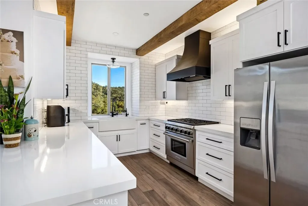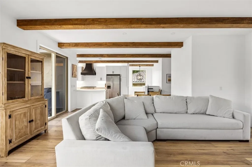 This split-level gem has a beautifully remodeled kitchen, wood beam detail on the ceilings throughout the primary living space, solid 8 foot white oak doors, and more. It features 3 spacious bedrooms and 2.5 bathrooms. The primary suite is thoughtfully situated on the upper living level, providing privacy and convenience. From both the primary bedroom and living area, there are sliding doors to access the landscaped yard with direct access to the welcoming hot tub and patio. The two guest bedrooms, a full bathroom, and garage access are located on the lower level. Every detail of this home has been tastefully updated, ensuring a modern and timeless feel.
