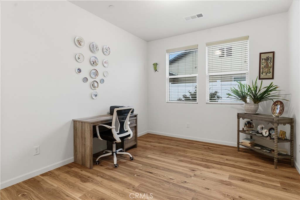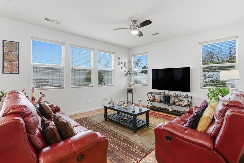 Welcome to this prestigious home located in the highly sought-after Highgate Seven Oaks Regents 55+ community gated community. This beautifully maintained residence features 2 bedrooms, 2 bathrooms, OWNED solar, and a den/bonus room currently used as a home office, offering flexible living space. Upgraded luxury vinyl plank flooring flows throughout the home, complemented by a minimal, low-maintenance landscape and solar for enhanced energy efficiency. Ideally situated directly across from the community clubhouse, the home provides convenient access to the gym and resort-style amenities including a full gym, chef’s kitchen, common areas, pool, jacuzzi, pickleball courts, putting green, and more. The HOA offers a robust calendar of community events and activities such as BBQs, bingo, bunco, quilting club, strength and movement classes, dance classes, cocktail nights, poker nights, book club, and many other social opportunities.