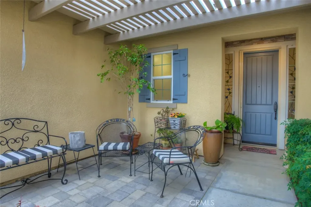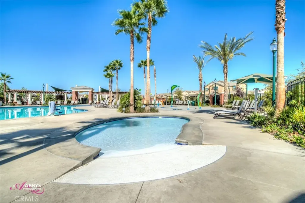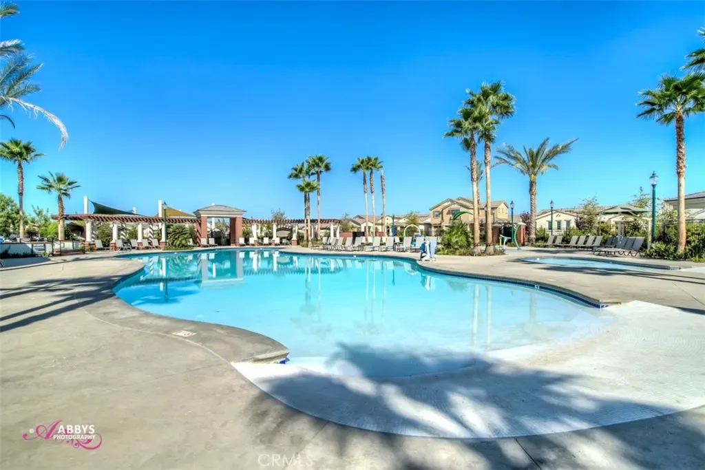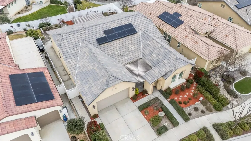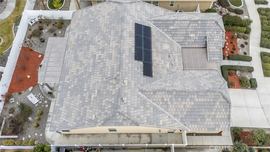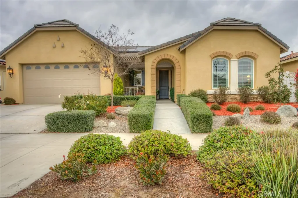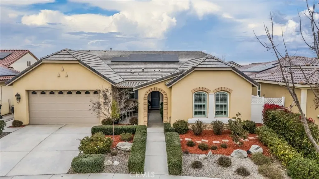 Resort-style living in the prestigious gated 55+ community of Highgate Regents. This impeccably designed 3-bedroom, 2-bath residence with a 2-car garage offers a desirable split-wing floor plan and an elegant open-concept great room enhanced by tray ceilings and recessed lighting. The chef’s kitchen showcases quartz countertops, an island, custom cabinetry with rich oil-rubbed bronze hardware, stainless steel appliances, and a well-appointed indoor laundry room with built-in storage. Luxury vinyl plank flooring flows seamlessly. The private primary suite is a true retreat, featuring dual vanities, a soaking tub, separate glass-enclosed shower, and a spacious walk-in closet. The designed backyard offers a covered patio, pergola, and expansive entertaining space. There is a tankless water heater and 7 solar panels. Enjoy amazing community with amenities including a clubhouse, resort-style pool, pickleball courts and so much more.