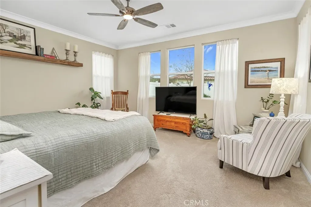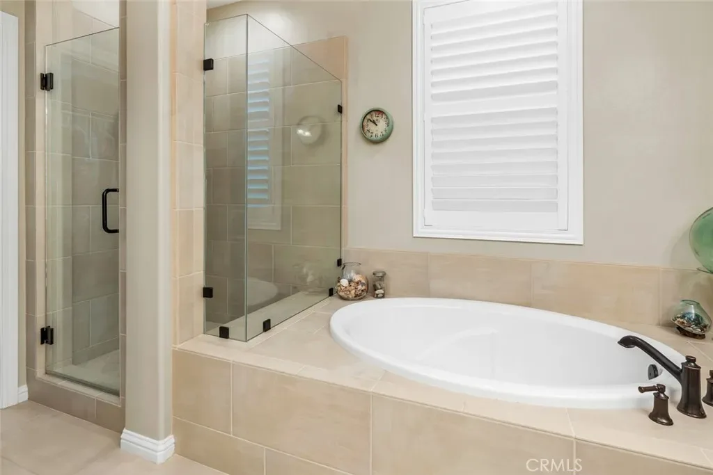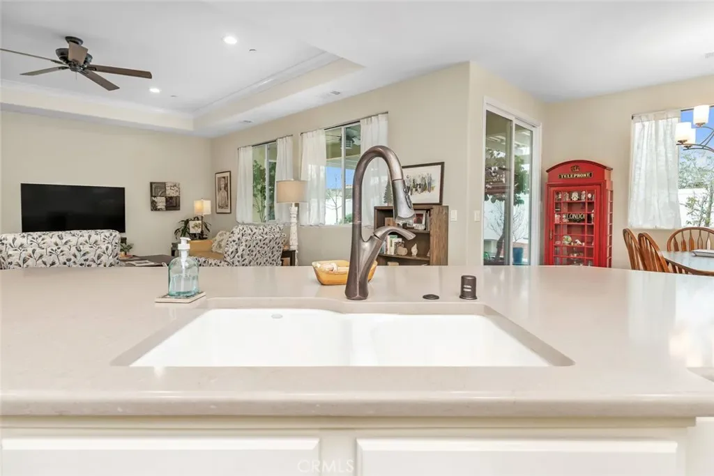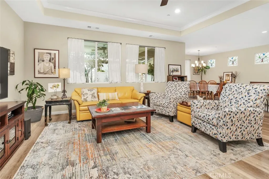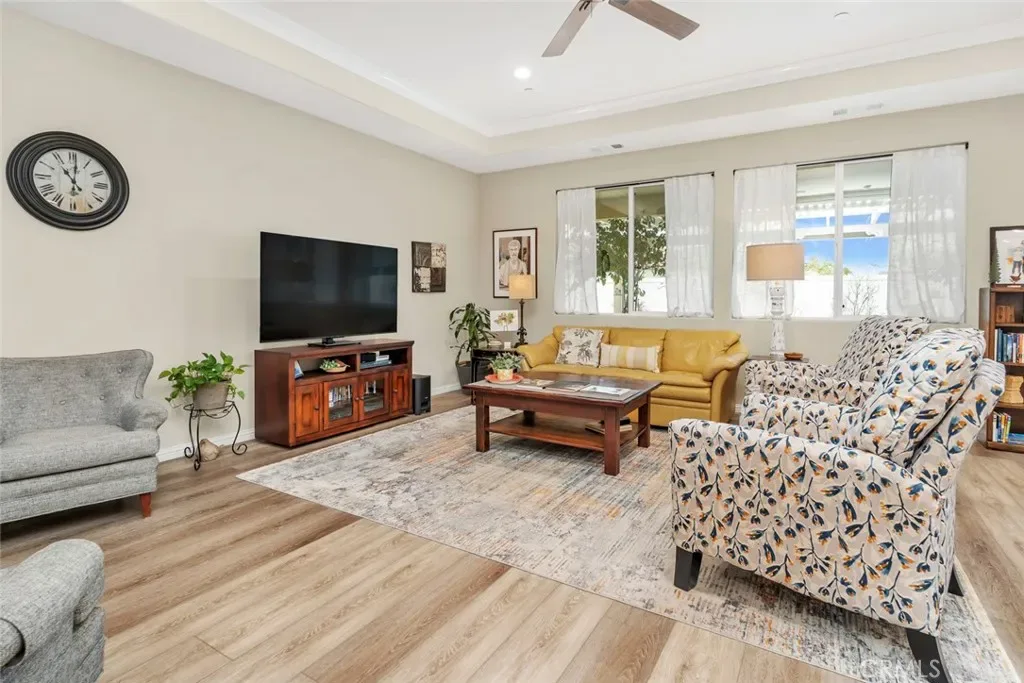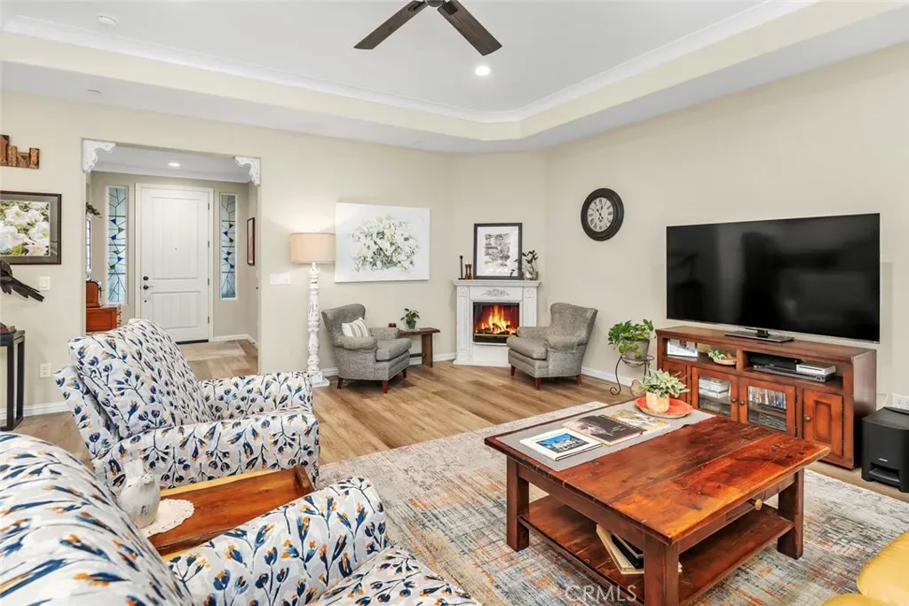 Resort-style living in the prestigious gated 55+ community of Highgate Regents. This impeccably designed 3-bedroom, 2-bath residence with a 2-car garage offers a desirable split-wing floor plan and an elegant open-concept great room enhanced by tray ceilings and recessed lighting. The chef’s kitchen showcases quartz countertops, an island, custom cabinetry with rich oil-rubbed bronze hardware, stainless steel appliances, and a well-appointed indoor laundry room with built-in storage. Luxury vinyl plank flooring flows seamlessly. The private primary suite is a true retreat, featuring dual vanities, a soaking tub, separate glass-enclosed shower, and a spacious walk-in closet. The designed backyard offers a covered patio, pergola, and expansive entertaining space. There is a tankless water heater and 7 solar panels. Enjoy amazing community with amenities including a clubhouse, resort-style pool, pickleball courts and so much more.