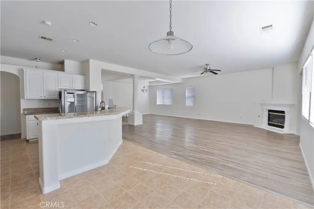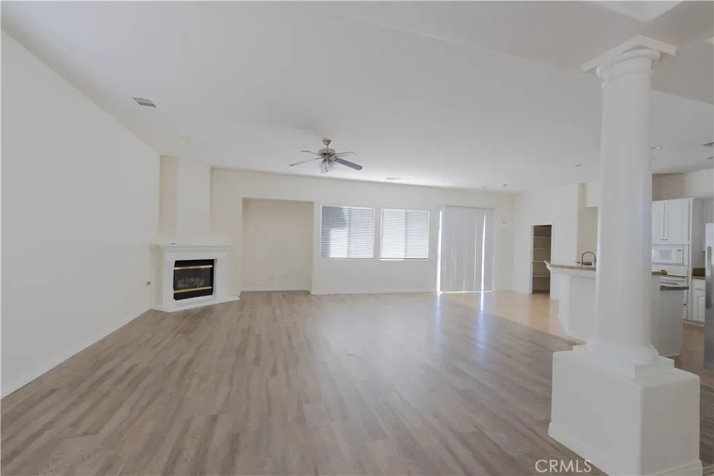 Step inside to an inviting open layout featuring laminated wood flooring throughout and a warm fireplace in the living room, creating the perfect setting for everyday living and entertaining. The well-appointed kitchen includes a built-in oven and microwave, dishwasher, and a bar-style granite countertop, ideal for casual dining and gatherings.