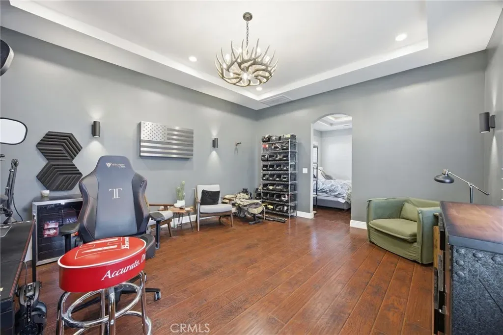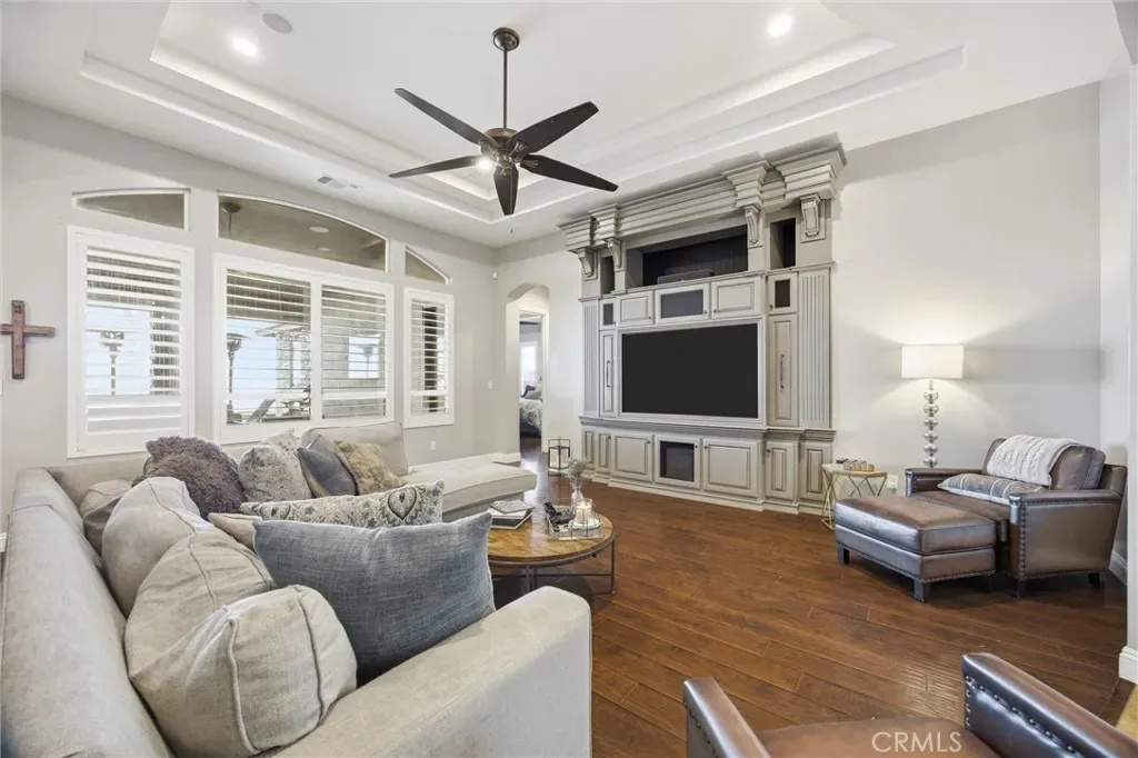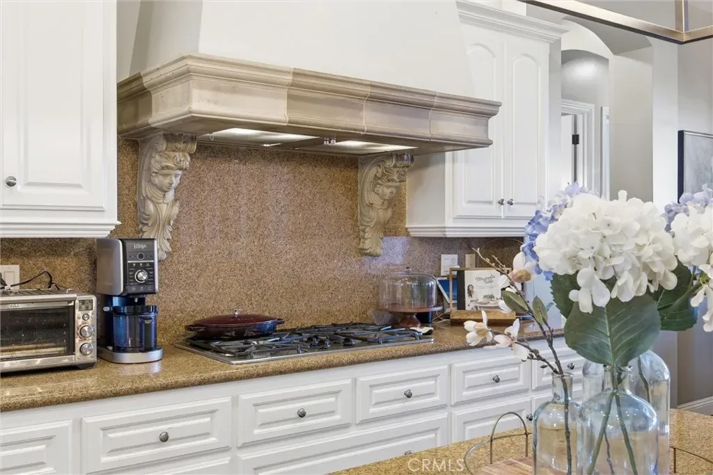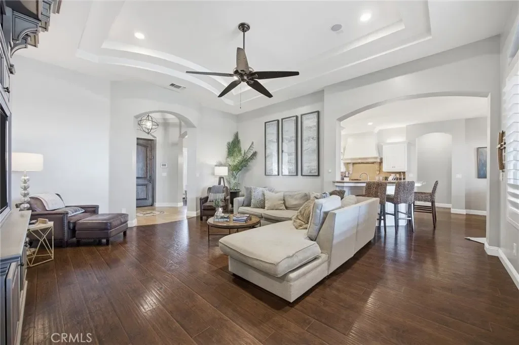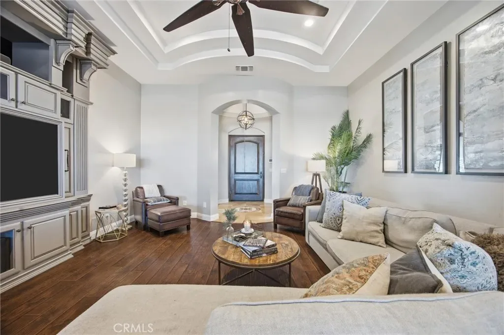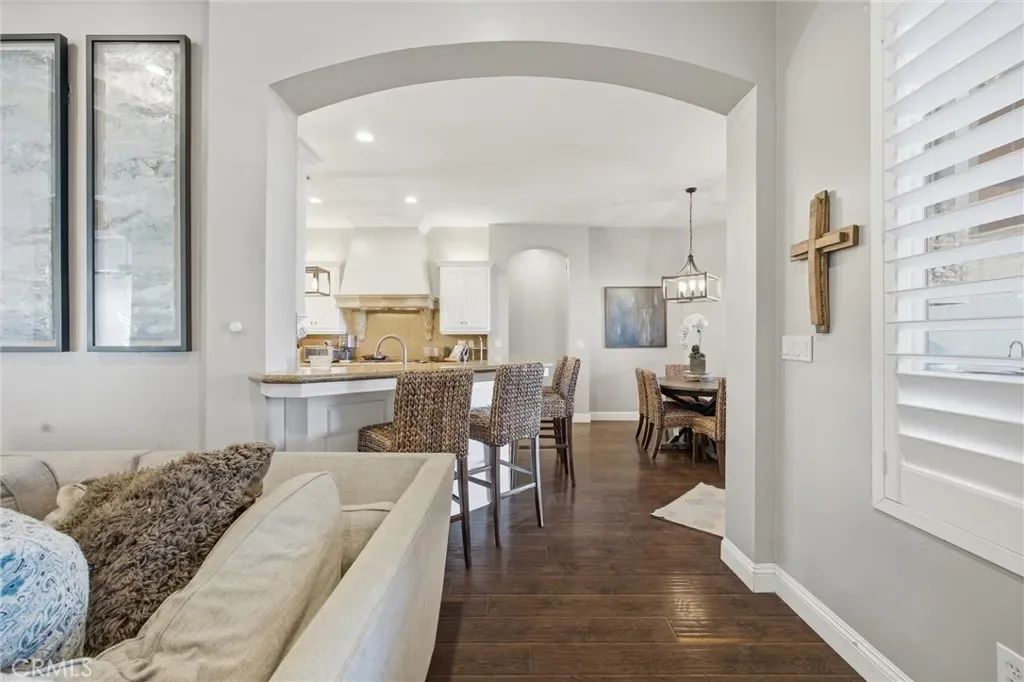 A striking stone-accented exterior and arched entry lead into a private courtyard with a charming fountain, creating a warm and inviting first impression. Inside, you’ll find rich wood flooring, high ceilings, and thoughtfully designed living spaces filled with natural light. The formal living room features a coffered ceiling, while arched doorways and architectural details add character throughout.