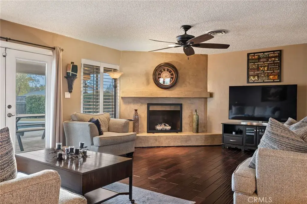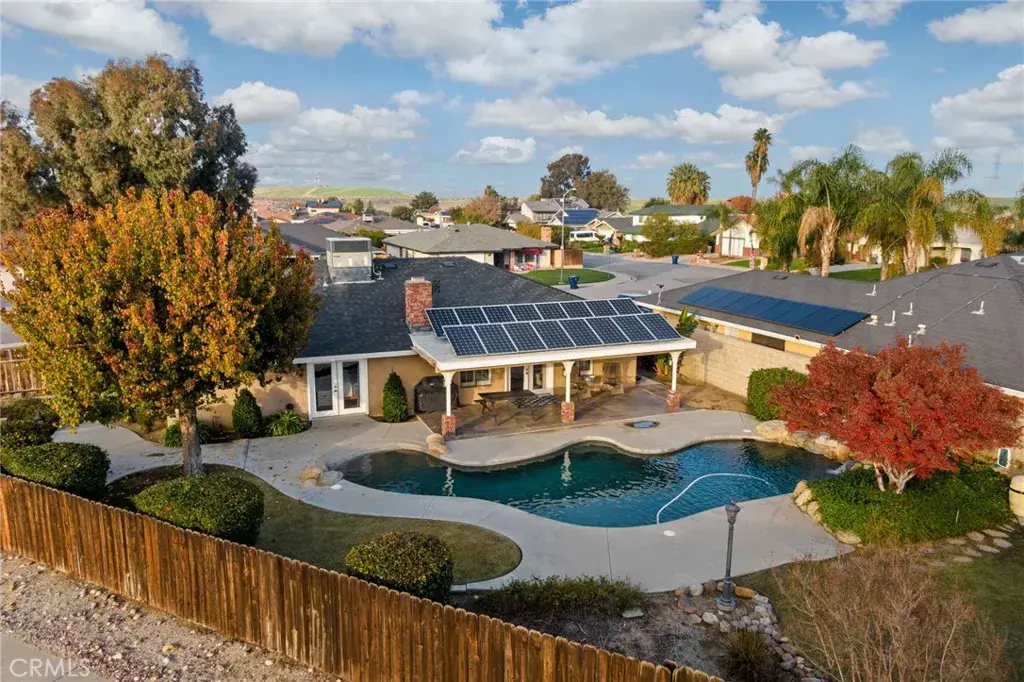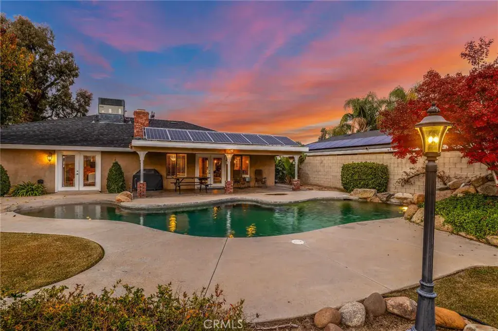 Fully paid solar and a resort-style pool make this home an exceptional find. Situated on a large corner lot, this property offers fully owned solar installed in 2015, a major perk that delivers immediate value and lower utility costs. Inside, hardwood flooring throughout creates a seamless, elevated look, while the living room is anchored by a sleek fireplace, adding warmth and a modern focal point. Plantation shutters in the living room, kitchen, and dining area enhance natural light and privacy. Major system upgrades include a new roof and HVAC installed in 2013, providing added confidence and comfort. Step outside to your private backyard retreat featuring a Pebble Tech pool with beach entry and waterfall, designed for both entertaining and everyday enjoyment. The large covered patio spaces extends the living area outdoors offering year-round use. Two sides of the backyard have block walls for durability and added privacy. Seller states home is closer to 1700 sqft. This home is truly move-in ready!