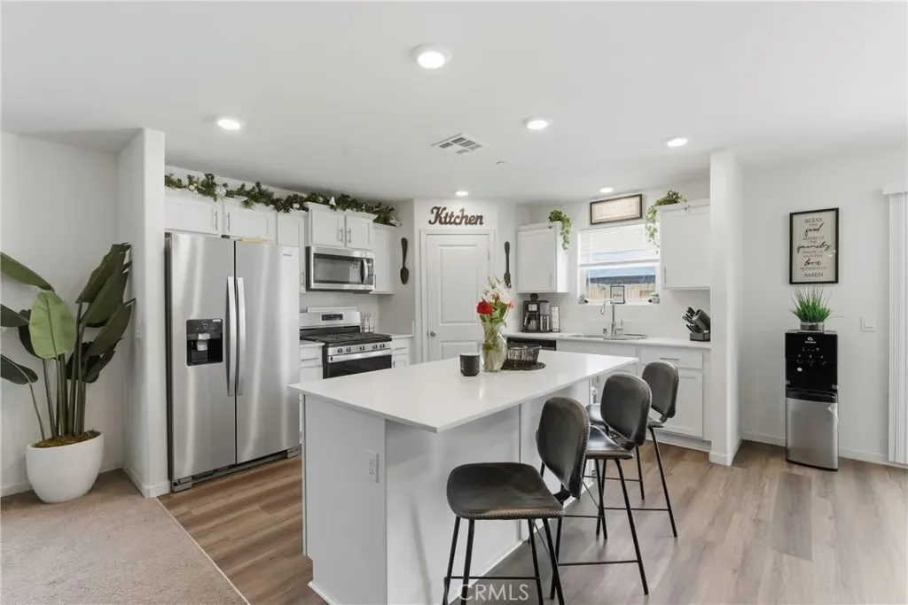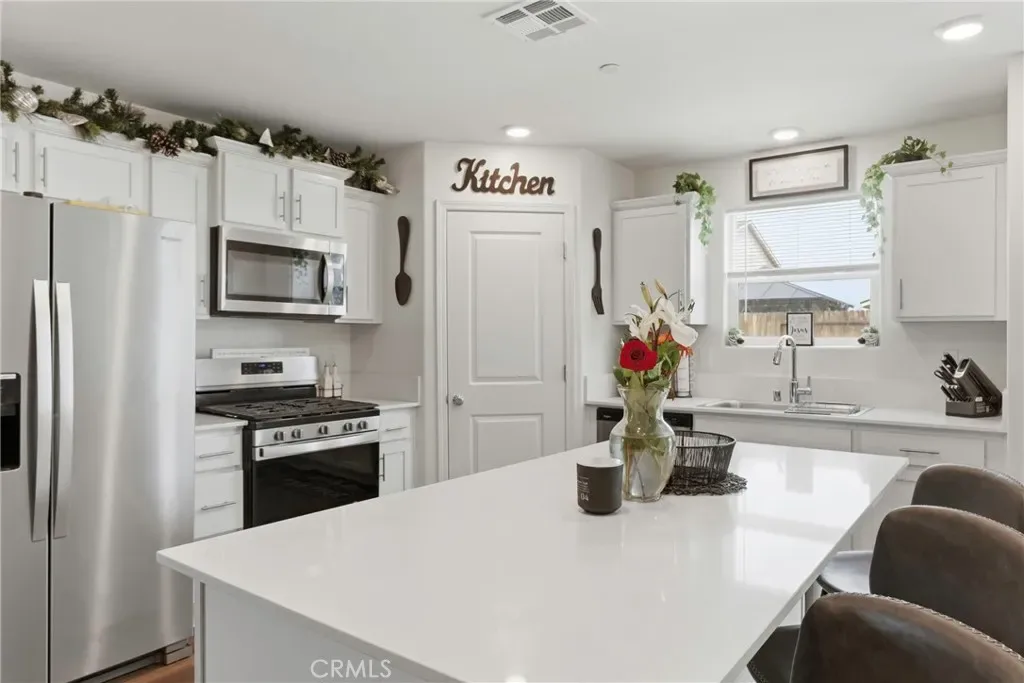 Welcome home to your single-story 4-bedroom, 3-bath home offering approximately 1,906 sq ft of thoughtfully designed living space. The open-concept layout features a spacious living room that flows seamlessly into the kitchen and dining area ideal for entertaining. The kitchen is appointed with shaker-style cabinetry with satin nickel hardware, quartz countertops, a center island with breakfast bar, walk-in pantry, and Whirlpool® stainless steel appliances including range, microwave, and dishwasher. The primary suite includes a dual-sink vanity and a generous walk-in closet. Conveniently located near schools, shopping, and dining, this move-in ready home presents an exceptional opportunity. Don’t miss out on this one.