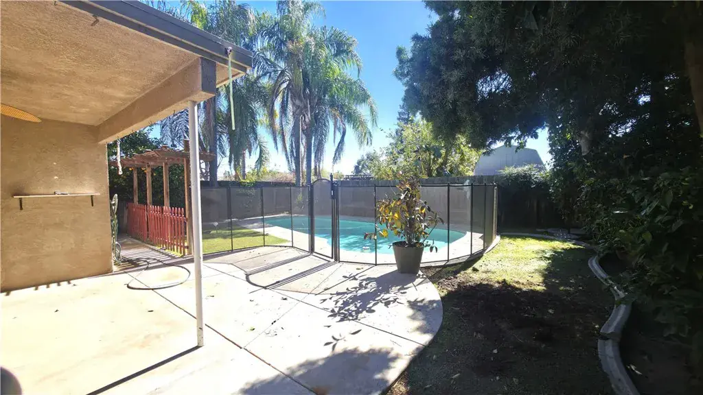 Welcome to this Northwest Bakersfield gem where timeless comfort meets California living at its finest. From the moment you arrive, the manicured façade, charming topiary plants flanking the garage, and welcoming entry create unforgettable curb appeal. Inside, luminous living spaces are thoughtfully designed for both everyday living and effortless entertaining. The spacious living room with a cozy fireplace flows seamlessly into a well-appointed kitchen and formal dining area, perfect for gatherings and memorable meals. A convenient indoor laundry room and versatile hallway nook offer ideal space for a home office or study. Each bedroom is generously sized with abundant natural light and a serene ambiance. Step outside to your private backyard retreat featuring a sparkling inground pool, lush palm trees, mature fruit trees, and a covered patio; perfect for relaxing mornings, lively summer pool parties, and peaceful sunset evenings. Additional highlights include central heat and air, laminate and tile flooring throughout and a quiet location in the desirable Madison Grove neighborhood. This beautiful home blends comfort, style, and location, ready to welcome its next proud owner.