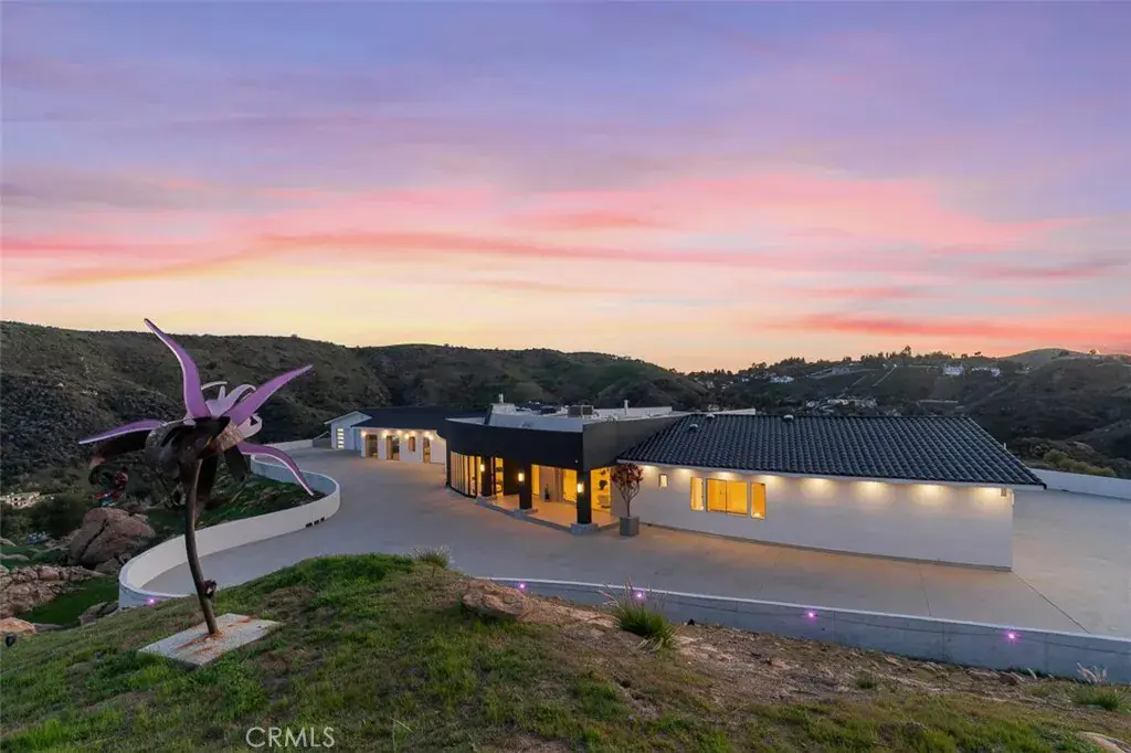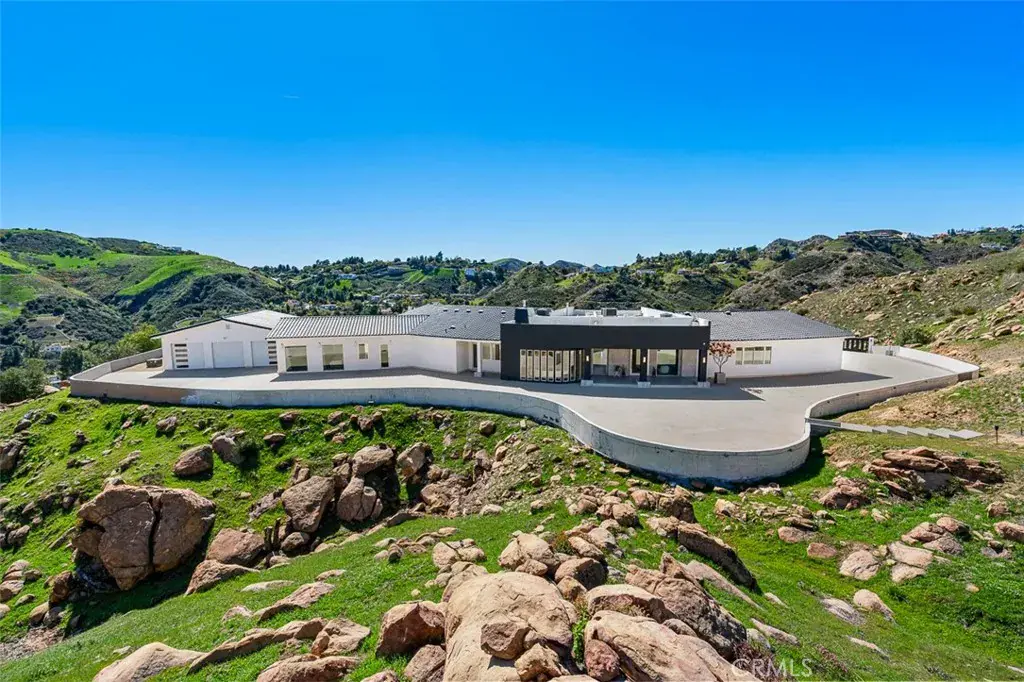 Discover the pinnacle of luxury living in this 2020-built, single-story modern estate, situated on over 31 private acres in the prestigious guard-gated community of Bell Canyon. Accessed via a triple-gated entry and a quarter-mile private driveway, this architectural masterpiece offers unobstructed 360-degree mountain vistas, ensuring both serenity and seclusion.