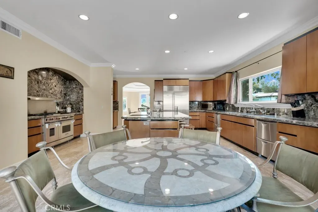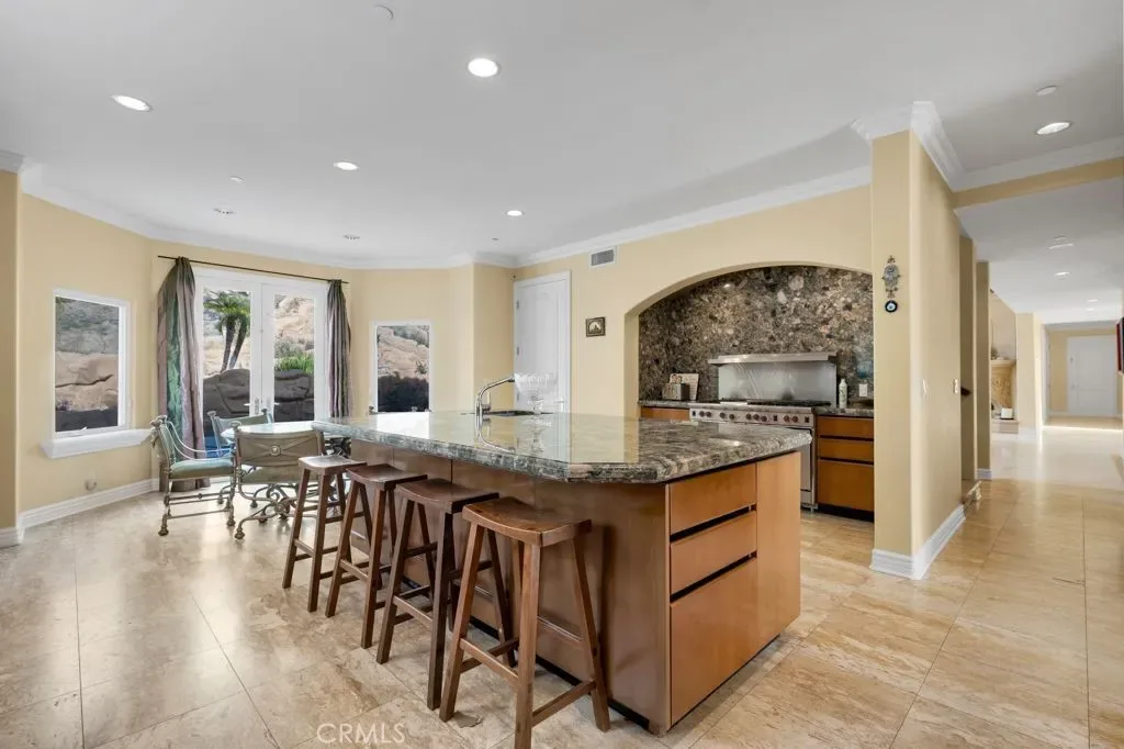 Exceptional custom Mediterranean estate in the prestigious 24-hour guard-gated community of Bell Canyon, offering privacy, elegance, and resort-style living. Ideally located on a quiet cul-de-sac with an elevated setting and private driveway, this impressive residence blends grand architecture with sophisticated comfort. Enter through dramatic iron double doors into a grand foyer that immediately sets the tone for the home’s scale and craftsmanship. This beautifully designed residence offers 5 bedrooms and 5.5 bathrooms, including a main-level ensuite bedroom and private office, perfect for guests, multigenerational living, or working from home. The home features a stunning formal living room with soaring ceilings, a fireplace, and a wet bar, a warm and inviting family room, and an elegant formal dining room ideal for entertaining. The gourmet chef’s kitchen is equipped with top-of-the-line appliances: Sub-Zero refrigerator, 6-burner Wolf range with convection double oven, Fisher& Paikel dishwasher, custom cabinetry, granite countertops, an oversized center island, a walk-in pantry, and a bright breakfast nook.