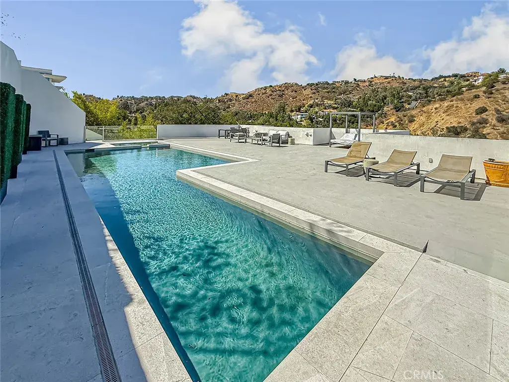 The grounds are equally impressive, featuring a sparkling pool and spa, multiple lounging terraces, and lush landscaping that create a true private retreat.