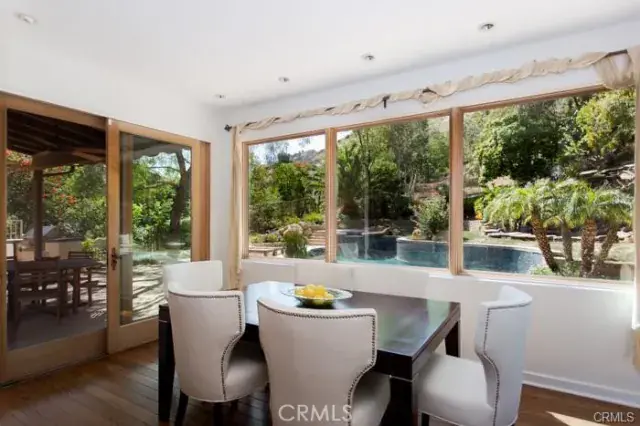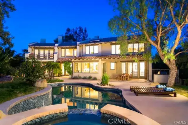 Located in the prestigious guard gated community of Bell Canyon, this custom Spanish Hacienda inspired estate is loaded with style and charm. The stunning architecture, quality construction, rare parking for at least 10+ cars, and very private natural setting all combine to create the perfect entertainer’s retreat. The open and flowing floor plan features an impressive entry with sweeping staircase and two story vaulted ceilings. The inviting living room features vaulted wood beamed ceilings, a stunning centerpiece fireplace and rich hardwood flooring. The grand dining room is scaled perfect for huge gatherings or an intimate candlelit dinner with views onto the gardens. The comfortable Family room is the perfect place to gather complete with hardwood floors and custom built ins. Take comfort in the private study or enjoy a game of pool in the billiards room. The granite center island kitchen is every gourmet chefs envy with a spacious breakfast nook with views onto the beautiful manicured rear grounds. The romantic master bedroom suite offers vaulted tongue and groove ceilings, a huge sitting area and custom fireplace. The 2 acre grounds offer spacious patios, lush landscape, a freeform pool and spa all with plenty of space for horses, play fields or what ever you wish.