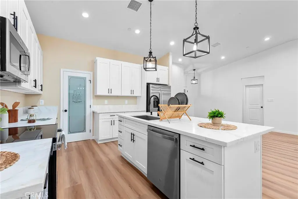 BEAUTIFUL BRAND NEW CONSTRUCTION!!!! Gorgeous 4 + 2, 2073 sq ft Single Family Home. This home has all the high-quality features that come with a modern semi-custom home. The standards that come with this home start with but not limited to a spacious, light and bright open floor plan, on-demand water heater, luxury vinyl plank flooring, dual pane argon gas filled windows, Quartz countertops, finger pull cabinets, quality appliances, ceiling fans and upgraded fixtures throughout, smart WI-FI thermostat, indoor laundry room, insulated garage, large fully fenced backyard, covered patio, front yard finished with beautiful hardscape, RV potential, exterior stucco and so much more. With all the modern conveniences of central heating & air, solar, and fire sprinklers, this house has it all!!!