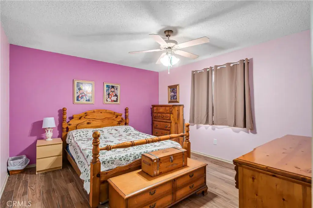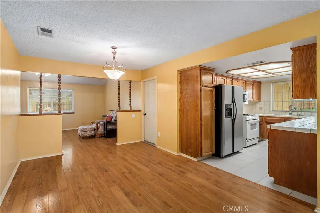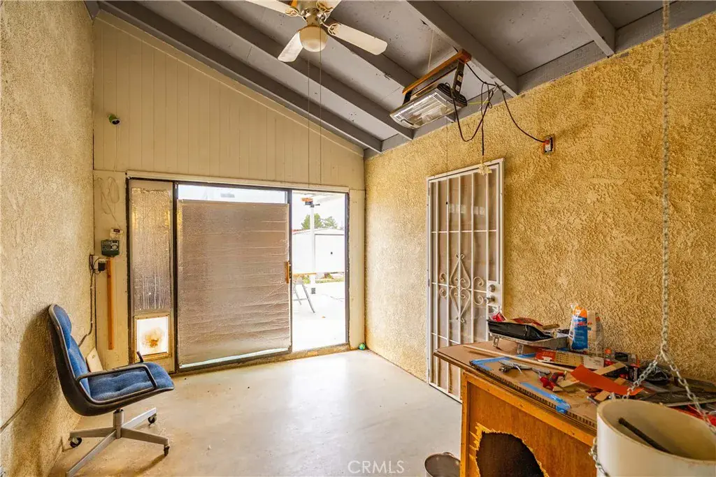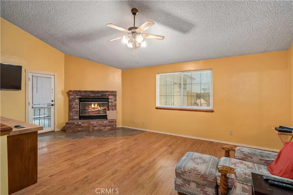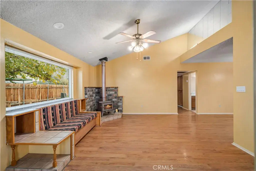 Well-maintained and energy-efficient 3-bedroom, two full bath single-story home with extensive upgrades and flexible living space. Features laminate and wood-tile flooring throughout. The living room offers a pellet stove and a ceiling fan. The family room includes laminate flooring, a brick hearth fireplace, and built-in cabinetry. Permitted 22′ x 13′ bonus room with separate entry, mini-split system, and dedicated solar panels covering utilities for that room—possible ADU or guest suite (buyer to verify with city). Ideal for extended family, home office, or rental-style use. The kitchen features tile flooring and counters, with a microwave included. Dining area with laminate flooring. Both bathrooms are full baths and have been updated with tile counters and tile floors; the second bath includes a walk-in shower. Bedrooms feature upgraded flooring and updated closet doors. Additional highlights include a heat pump with new ducting, hardwired security cameras, a whole-house vacuum system plumbed, updated windows (including atrium windows, approx. 8 years old), rain gutters, an enclosed patio with a ceiling fan, a wood-fenced backyard, and a shed. The garage offers 220V wiring with a compressor included, plus a washer and dryer; all appliances stay. The main house roof is less than one year old. Solar installed in 2022 at approx. $138/month, covering all Edison electric usage. Move-in ready home offering energy efficiency, versatility, and strong potential for added value. Call today won’t last long!!!