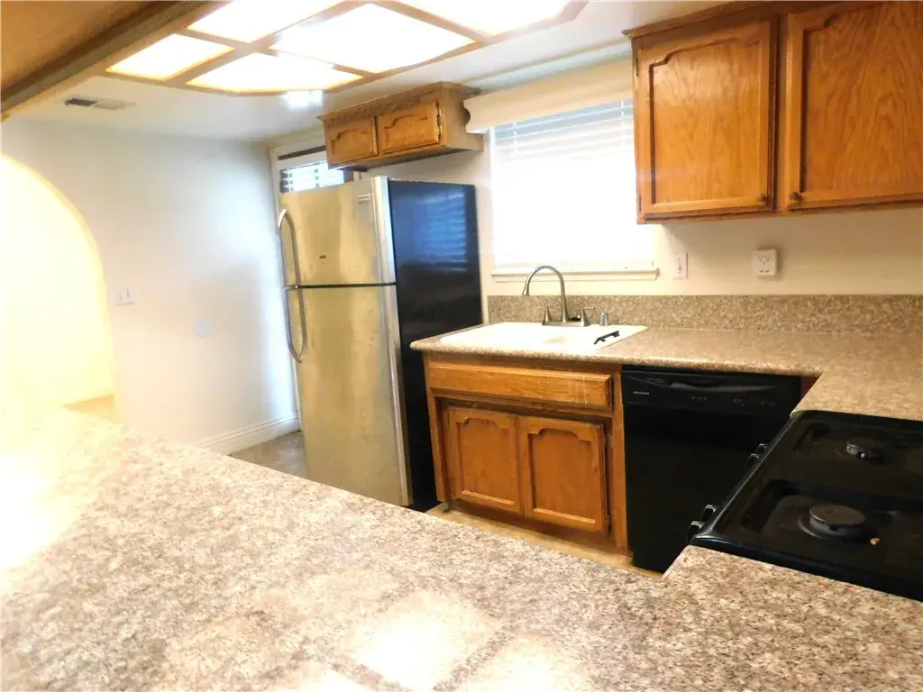 Kitchen has refrigerator, stove, dishwasher and plenty of storage cabinets.