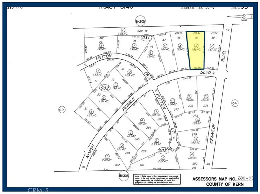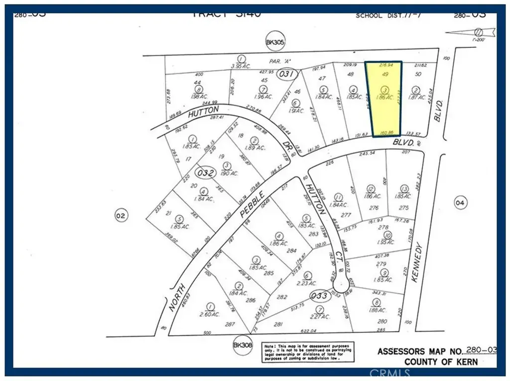 Lot 49 Map 3140, 1.86 Acres, (Apn: 280-031-03-007) GPS: 35.21602, -117.78711 on Pebble Blvd in California City, CA. California City is in northern Antelope Valley in Kern County. California City is 18 miles northwest of Edwards Air Force Base, 40 miles north of Lancaster and 28 miles east of Tehachapi. California City has zoned this property as RM1/MR2 Multiple Family Residential. According to the City the following uses are permitted: Single Family Dwellings, multiple family dwellings, riding stables, corrals and animal keeping. No utilities are currently available to this lot. Electricity is approx 1100 ft East. Please check with the City for water and sewer distance. Please use GPS Coordinates to locate property GPS: 35.21602,-117.78711