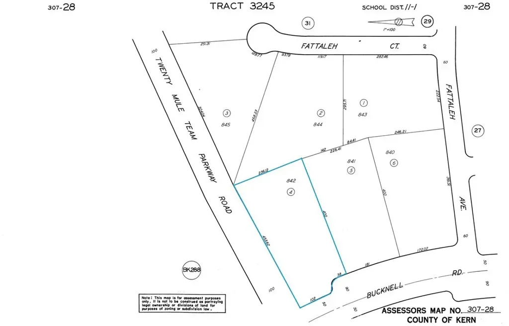 Twenty Mule Team Parkway at Bucknell Rd, California City, CA 93505 APN: 307-280-04. For sale is a 2.17 vacant multi family residential lot on Twenty Mule Team Parkway in California City. This is for off the grid living. Directions: Start at the Starbucks at 9678 California City Blvd, California City, CA 93505 then enter that address as the beginning address into your phone, then add these GPS coordinates as the ending address: 35.208645, -117.739142. You will be at the corner of Twenty Mule Team Parkway at Bucknell Rd. The lot is at the southeast corner. Please use the parcel map from here. GPS Coordinate: 35.208645, -117.739142