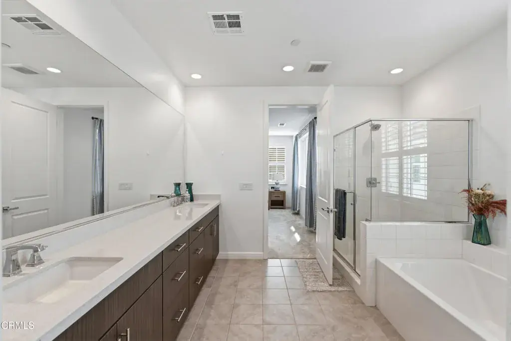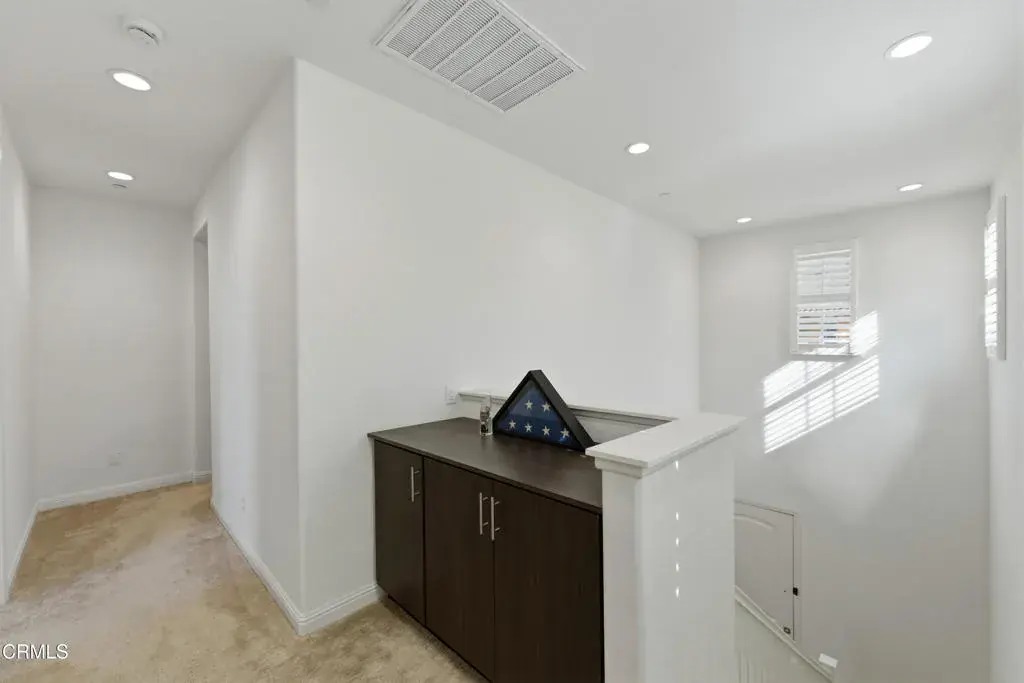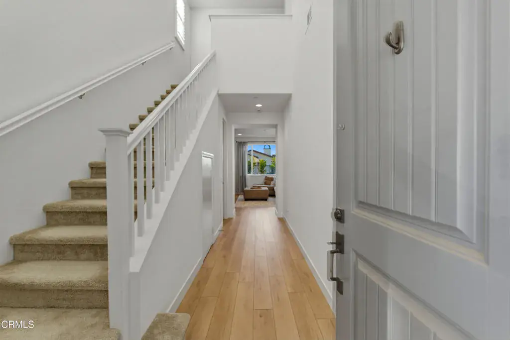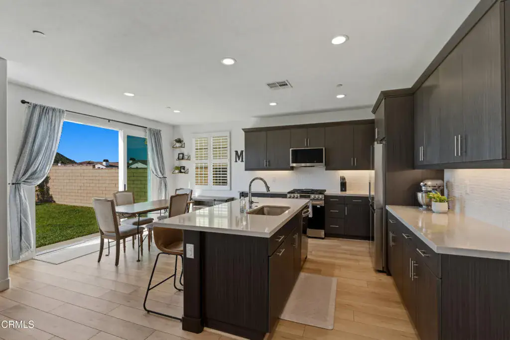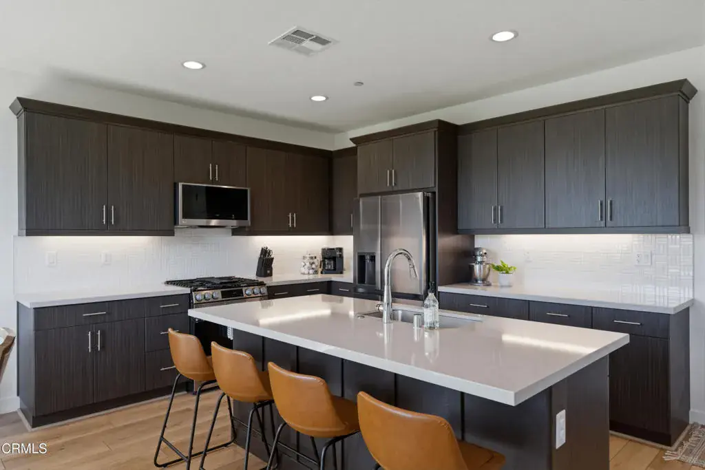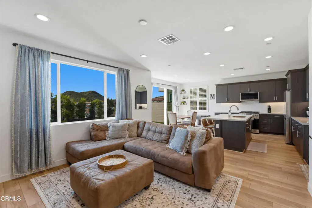 Welcome to the newly constructed Anacapa Canyon neighborhood in Camarillo. Completed in late 2023, this stunning 3-bedroom, 2.5-bath, 1,708 sq ft home offers an exceptional opportunity for first-time homebuyers or seasoned Camarillo residents seeking modern finishes, a spacious backyard, and expansive scenic views. Upon entering, you’re welcomed by tall ceilings and luxurious wood-style vinyl plank flooring that leads into a beautifully designed living room, featuring a custom-built entertainment unit with built-in cabinetry, striking electric fireplace framed by a modern wood mantel, floating shelves, and board-and-batten accents. The open-concept kitchen showcases contemporary gray cabinetry and quartz countertops and stainless-steel LG ThinQ smart appliances, including a gas range, oven, microwave, refrigerator and dishwasher. A large center island comfortably seats four, with the kitchen positioned to take advantage of beautiful backyard views. The space also includes a designated dining area and a large sliding glass door for effortless indoor-outdoor living. Upstairs, the spacious primary suite offers a serene retreat with a bright white bathroom featuring an oversized shower, soaking tub, separate toilet area, dual sinks and a massive walk-in closet. Two additional bedrooms and bathroom are located down the hall, along with a large laundry room and linen storage. Additional highlights include white plantation shutters throughout, modern square-edge baseboards, a Honeywell Home Pro Series smart thermostat, and a beautifully landscaped grass backyard with rear hedges for added privacy. Residents enjoy luxury community amenities, including an expansive resort-style pool and two jacuzzis, kids’ pool, playground, lounge areas with firepits, a fully equipped fitness center with a kids’ area, covered patio spaces with BBQs, and an impressive clubhouse featuring a modern kitchen, pool table, shuffleboard, coffee/cappuccino machine, business/work area, and spacious entertainment areas with TVs, couches, tables, etc. Owners also have access to two additional pools and clubhouses in the University Glen community, along with two parks, designated dog park, basketball court and large greenbelt. This serene and thoughtfully designed neighborhood delivers luxury living with exceptional amenities. It also offers the rare opportunity to own a 2023-constructed home with a spacious backyard, an increasingly uncommon feature in newer Camarillo developments.