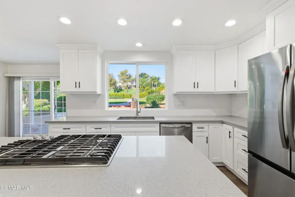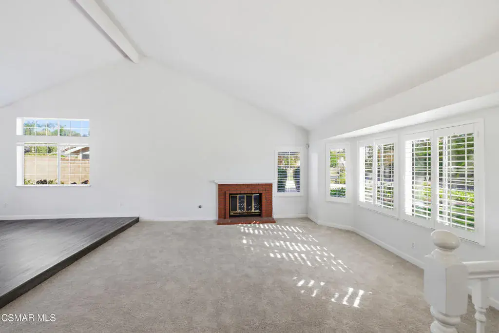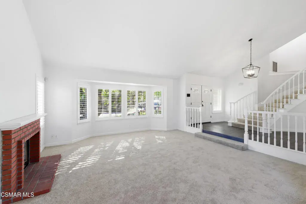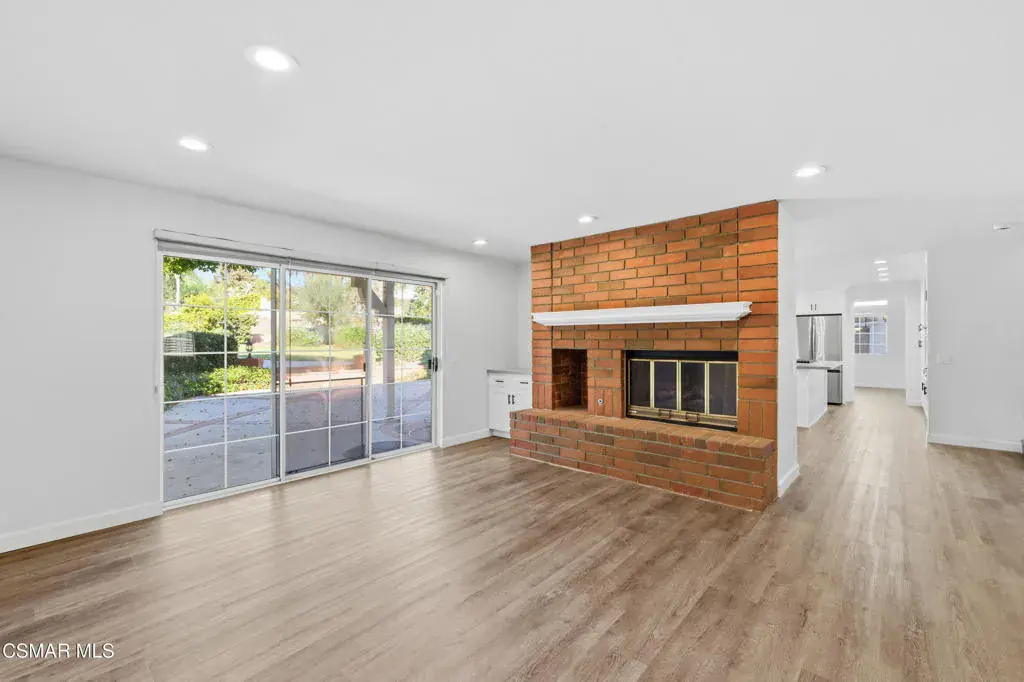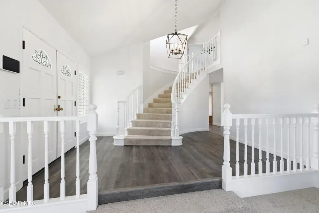Situated on a tree-lined street in one of Camarillo’s most desirable neighborhoods, this beautifully remodeled residence offers an exceptional blend of elegance and comfort. A striking spiral staircase sets the tone for the home, complemented by fresh interior paint, plantation shutters, and recessed lighting throughout. The home welcomes you into a bright, naturally lit space, highlighting updated LVP flooring and plush carpet. The main level features two distinct living rooms, each accented by its own gas fireplace, providing versatile areas for both formal entertaining and everyday living. One living room flows into the formal dining area, creating an inviting setting for gatherings. The kitchen has been thoughtfully updated with modern cabinetry, stainless steel appliances, refined quartz countertops, and a casual dining space with sliding doors that open to the spacious entertainer’s backyard. The outdoor area features a large, well-maintained grass lawn, a basketball court, and mature, producing lemon trees, offering ample room for recreation, play, or hosting guests. The front yard also boasts a generous grassy area, enhancing curb appeal and creating a welcoming approach. The second living room includes a wet bar and a sliding door that opens directly to the backyard, ideal for entertaining or relaxing. The main level also includes a bedroom with an en suite bathroom, an interior laundry room, and direct access to a three-car garage. Upstairs features two generously sized bedrooms in addition to the primary retreat, which showcases triple sliding doors and a private balcony. The renovated en suite bathroom features a soaking tub, luxurious designer finishes, and dual walk-in closets. Don’t miss the opportunity to make this impressive home yours.