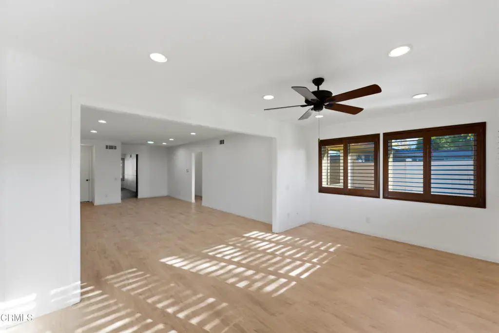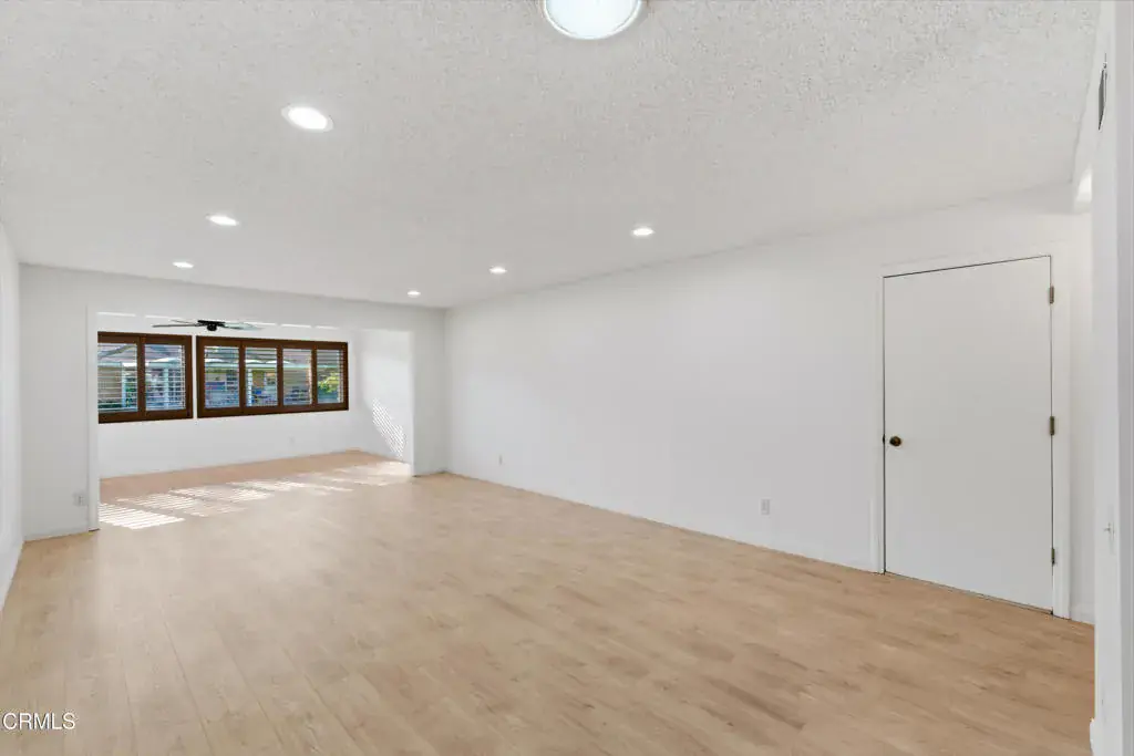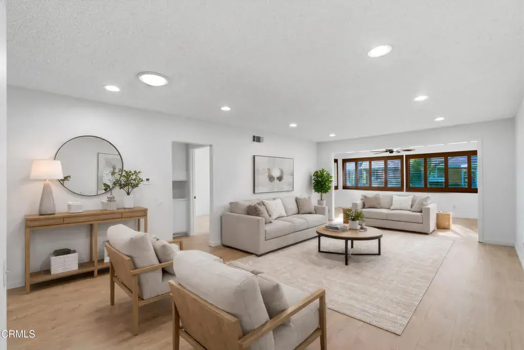 New beautiful interior and incredible new price! Lovely expanded Del Mar model in Leisure Village with remodeled interiors and brand new beautiful flooring throughout. There is also a beautiful added den overlooking the greenbelt. This 2 bedroom, 2 bath home includes an approx. 165 sq. ft. permitted expansion that creates a spacious den or extended living area with multiple windows and peaceful views behind the home–ideal for reading, hobbies, or flexible seating.The kitchen has been tastefully upgraded with cherry cabinetry, granite counters, custom shutters, and quality finishes. Both bathrooms mirror the same elevated look, featuring matching cherry cabinetry, granite counters, and updated fixtures. The layout maintains the classic Del Mar flow while offering the benefit of added square footage and natural light enhanced by skylights.This home is located in Camarillo’s premier 55+ guard-gated community, very near amazing amenities offered in Leisure Village including expansive clubhouse with library & workshops, golf course, pool, hot tub, pickleball, tennis, fitness center and so much more. This home is move-in ready and positioned for its next homeowner to enjoy everything Leisure Village offers–security, amenities, and a low-maintenance lifestyle.