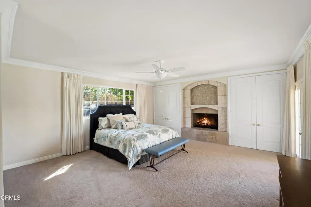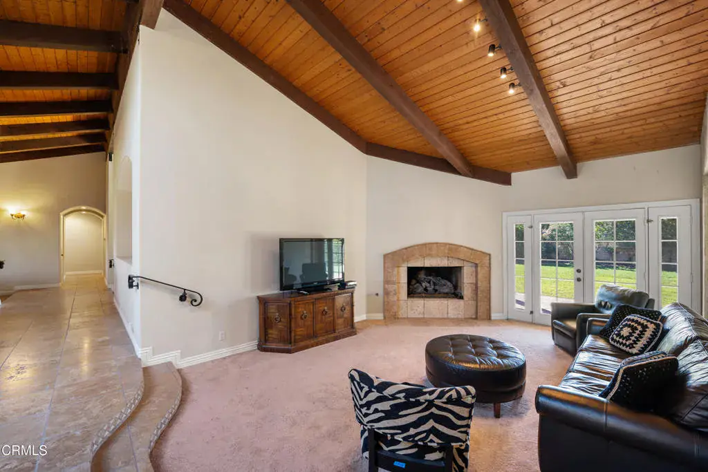 Upon arriving to this beautiful, well maintained, Tuscan style home, you are welcomed to a gorgeous front yard and porch offering mountain views. Walk past the unfinished wine room entrance with wrought iron and glass doors on the left and enter the front door to discover a home ready for entertaining. The main living room greets you with high wood and open beam ceilings, a fireplace and room for a grand piano windows with views of the expansive backyard. To the left of the entrance you enter the main bedroom wing of the home. The Primary bedroom is an owner’s private retreat with another fireplace, french doors to back patio, and plenty of room to relax. The primary bathroom includes a jacuzzi tub, large walk-in shower, double sink vanity, and a space for a large walk-in closet. This wing of the home also offers two other bedrooms and a second full bathroom with a double sink vanity. The fourth bedroom is located on the north wing of the home off of the family-room, which includes another full bath, a large separate laundry room, pantry, and anexterior entrance. . Perfect for guests or multi-generational living. Step down into inte the office which also has a private exterior entrance for those that may work from home. The family room is open concept to the kitchen enhanced with french doors leading to the back patio and also has aother fireplace. 4 fireplaces total, two of the interior fireplaces all have gas logs with remote controls. The kitchen and formal dining area have views of the Topa Topa mountains. This 22,686 sqft corner lot includes fruit and avocado trees on the south side yard. The expansive west facing backyard is perfect for sunset gatherings on the large covered patio warmed by another wood burning fireplace. Plenty of room for a pool, RV, or possible ADU. Parking is not an issue for you or your guest, the large 6 car driveway leads to an over-sized three car garage with solid wood roll up doors. Live, work, play in the beautiful Los Posas Golf estates.