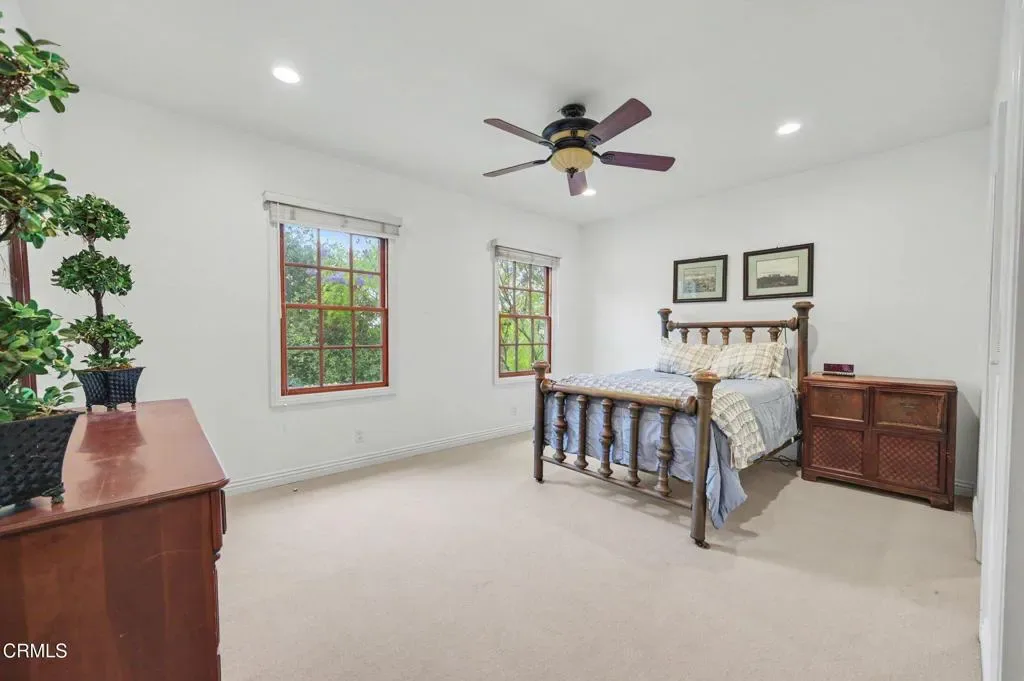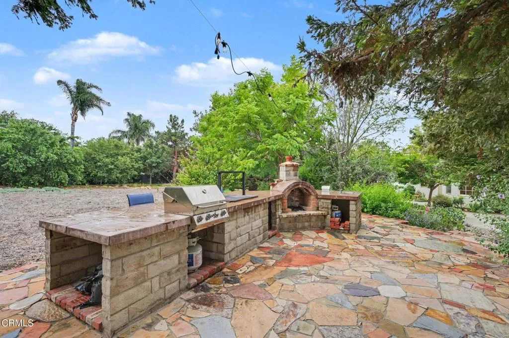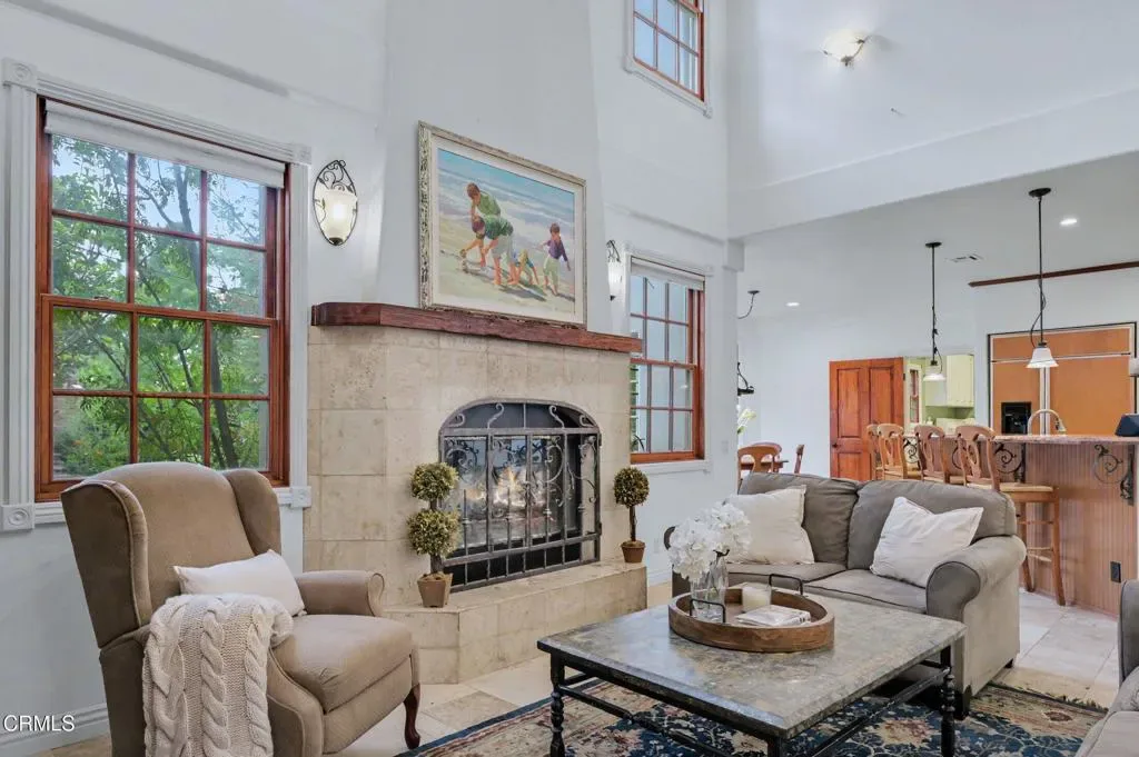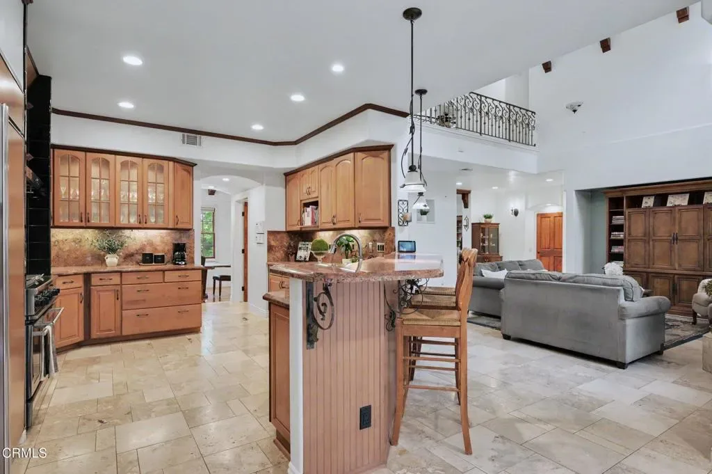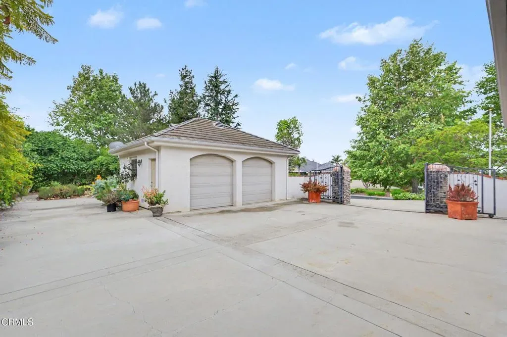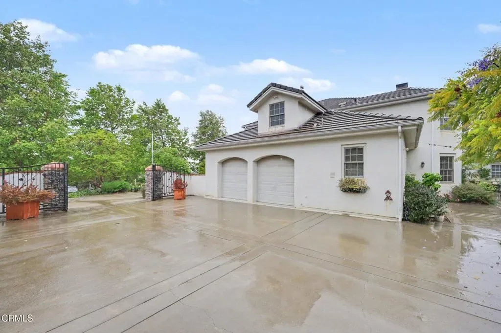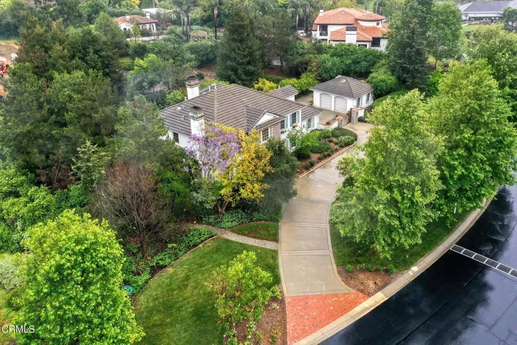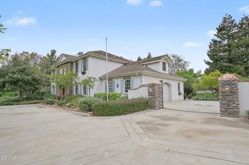 This extraordinary 5 bed, 4.5 bath custom estate is located on over an acre of land in Bella Vista, one of Ventura County’s most desirable gated communities. Designed with both flexibility and everyday living in mind, the home features a highly sought-after primary suite on the main level, along with a spacious downstairs family room, office, and laundry room, ideal for single-level living if desired. The primary suite includes its own fireplace, dual walk-in closets, and an en-suite bath with custom vanities and a Jacuzzi tub. The lower level showcases a dynamic, open-concept layout with a double-height vaulted family room that flows into the kitchen. The kitchen features a large breakfast bar with seating for four, a breakfast nook, ample storage, and a walk-in pantry, and connects to the formal dining room overlooking the front landscaping. A separate formal living room with a fireplace provides an additional gathering space. Upstairs, four additional bedrooms are complemented by a versatile loft-style bonus space, perfect for a playroom, office, or additional lounge area, complete with its own window and generous attic storage.Outside, the grounds are a standout feature, with mature landscaping and a variety of fruit trees blooming for your enjoyment. The backyard includes an extensive built-in barbecue area and a large open space that can accommodate a pool, spa, pickleball court, or outdoor events. The property includes both an attached two-car garage and a detached two-car garage, offering flexibility for additional parking, a workshop, or office space. A circular driveway and mature front trees enhance both privacy and curb appeal. Lime, lemon, pomegrante, apricot, apple, champagne grapes, orange, artichokes, and figs make this a gardener’s paradise. Located in Camarillo, Bella Vista offers convenient access to nearby golf courses including Las Posas Country Club, Sterling Hills, and Spanish Hills, as well as easy access to both Los Angeles and Santa Barbara.With fewer than 100 custom homes in this community, Bella Vista offers a rare sense of privacy, tranquility, and timeless appeal. Offered for the first time since its original construction, this home presents a unique opportunity in a highly sought-after community.