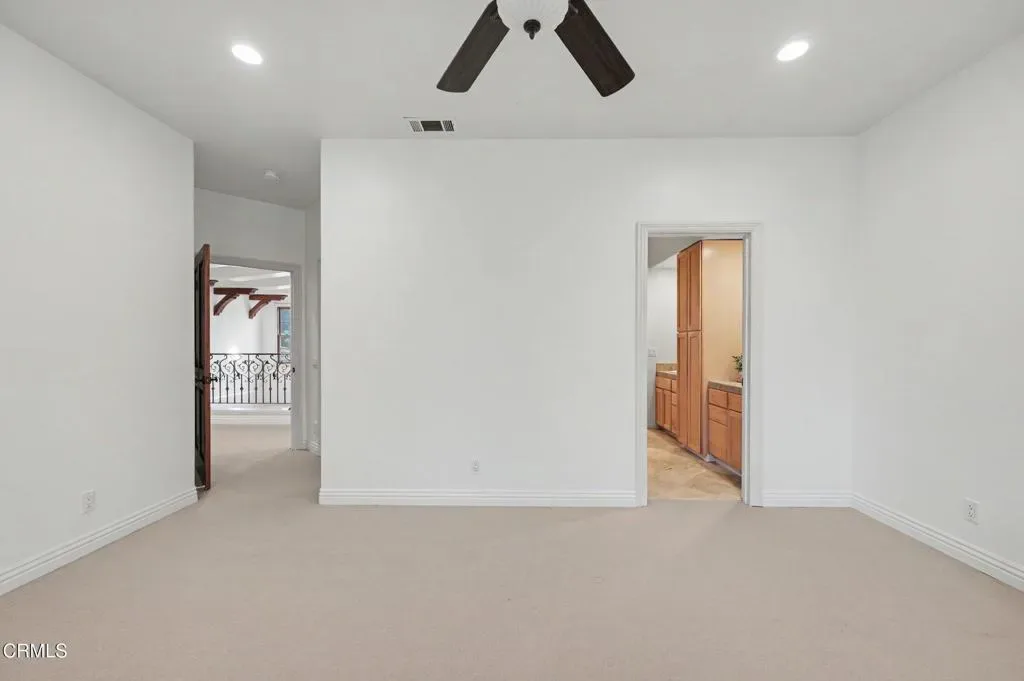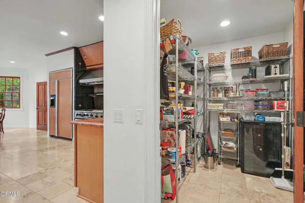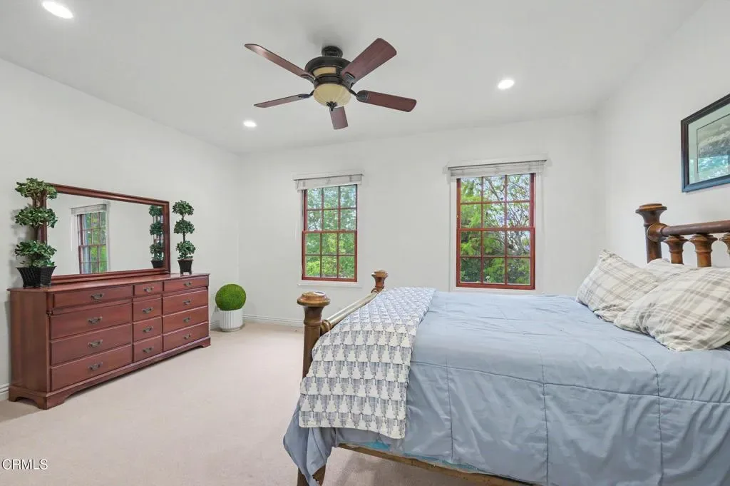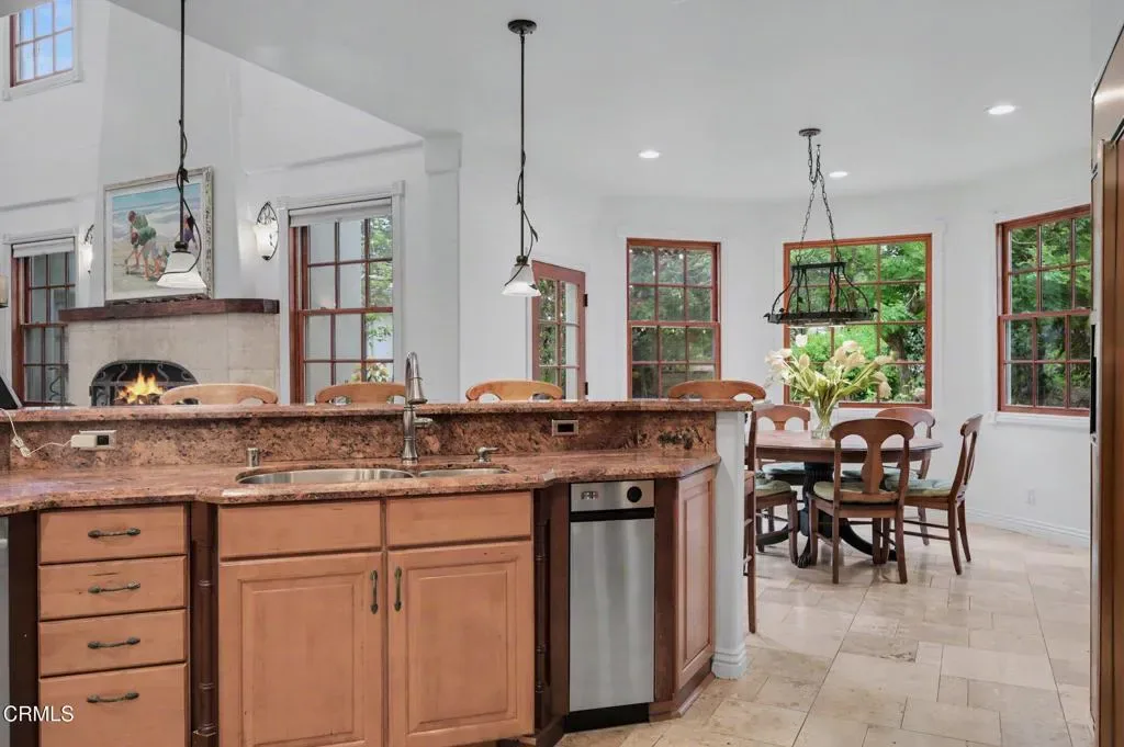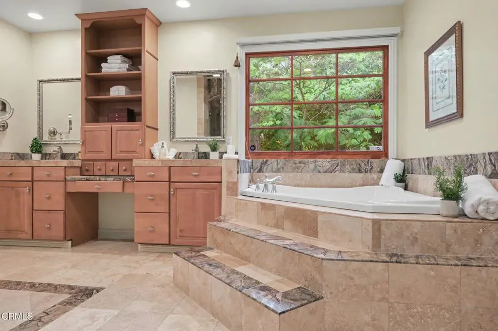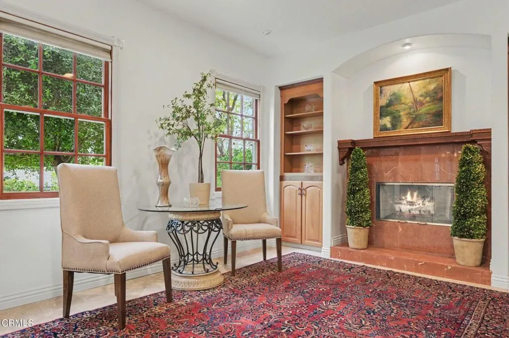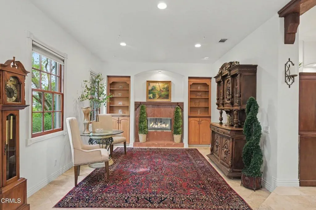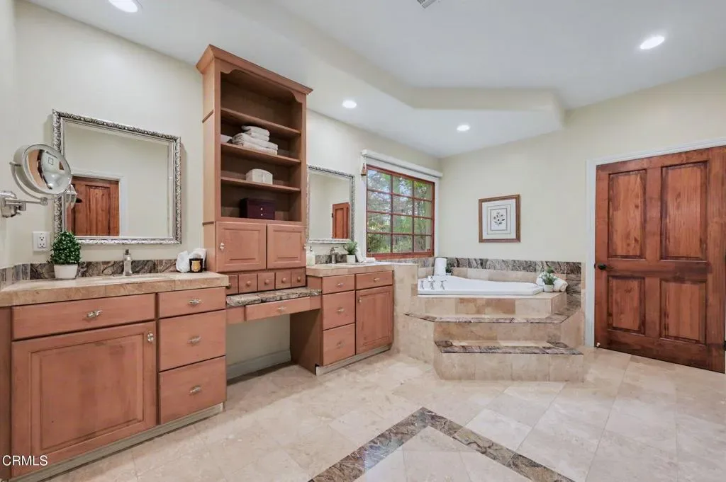 This extraordinary 5 bed, 4.5 bath custom estate is located on over an acre of land in Bella Vista, one of Ventura County’s most desirable gated communities. Designed with both flexibility and everyday living in mind, the home features a highly sought-after primary suite on the main level, along with a spacious downstairs family room, office, and laundry room, ideal for single-level living if desired. The primary suite includes its own fireplace, dual walk-in closets, and an en-suite bath with custom vanities and a Jacuzzi tub. The lower level showcases a dynamic, open-concept layout with a double-height vaulted family room that flows into the kitchen. The kitchen features a large breakfast bar with seating for four, a breakfast nook, ample storage, and a walk-in pantry, and connects to the formal dining room overlooking the front landscaping. A separate formal living room with a fireplace provides an additional gathering space. Upstairs, four additional bedrooms are complemented by a versatile loft-style bonus space, perfect for a playroom, office, or additional lounge area, complete with its own window and generous attic storage.Outside, the grounds are a standout feature, with mature landscaping and a variety of fruit trees blooming for your enjoyment. The backyard includes an extensive built-in barbecue area and a large open space that can accommodate a pool, spa, pickleball court, or outdoor events. The property includes both an attached two-car garage and a detached two-car garage, offering flexibility for additional parking, a workshop, or office space. A circular driveway and mature front trees enhance both privacy and curb appeal. Lime, lemon, pomegrante, apricot, apple, champagne grapes, orange, artichokes, and figs make this a gardener’s paradise. Located in Camarillo, Bella Vista offers convenient access to nearby golf courses including Las Posas Country Club, Sterling Hills, and Spanish Hills, as well as easy access to both Los Angeles and Santa Barbara.With fewer than 100 custom homes in this community, Bella Vista offers a rare sense of privacy, tranquility, and timeless appeal. Offered for the first time since its original construction, this home presents a unique opportunity in a highly sought-after community.